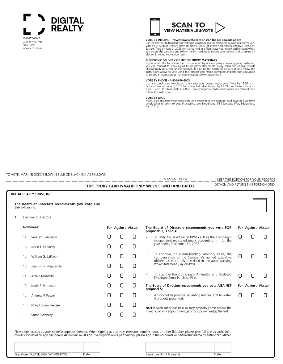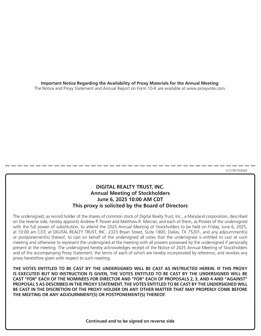 Important Notice Regarding the Availability of Proxy Materials for the Annual Meeting: The Notice and Proxy Statement and Annual Report on Form 10-K are available at www.proxyvote.com. DIGITAL REALTY TRUST, INC. Annual Meeting of Stockholders June 6, 2025 10:00 AM CDT This proxy is solicited by the Board of Directors The undersigned, as record holder of the shares of common stock of Digital Realty Trust, Inc., a Maryland corporation, described on the reverse side, hereby appoints Andrew P. Power and Matthew R. Mercier, and each of them, as Proxies of the undersigned with the full power of substitution, to attend the 2025 Annual Meeting of Stockholders to be held on Friday, June 6, 2025, at 10:00 am CDT, at DIGITAL REALTY TRUST, INC. 2323 Bryan Street, Suite 1800, Dallas, TX 75201, and any adjournment(s) or postponement(s) thereof, to cast on behalf of the undersigned all votes that the undersigned is entitled to cast at such meeting and otherwise to represent the undersigned at the meeting with all powers possessed by the undersigned if personally present at the meeting. The undersigned hereby acknowledges receipt of the Notice of 2025 Annual Meeting of Stockholders and of the accompanying Proxy Statement, the terms of each of which are hereby incorporated by reference, and revokes any proxy heretofore given with respect to such meeting. THE VOTES ENTITLED TO BE CAST BY THE UNDERSIGNED WILL BE CAST AS INSTRUCTED HEREIN. IF THIS PROXY IS EXECUTED BUT NO INSTRUCTION IS GIVEN, THE VOTES ENTITLED TO BE CAST BY THE UNDERSIGNED WILL BE CAST “FOR” EACH OF THE NOMINEES FOR DIRECTOR AND “FOR” EACH OF PROPOSALS 2, 3, AND 4 AND “AGAINST” PROPOSAL 5 AS DESCRIBED IN THE PROXY STATEMENT. THE VOTES ENTITLED TO BE CAST BY THE UNDERSIGNED WILL BE CAST IN THE DISCRETION OF THE PROXY HOLDER ON ANY OTHER MATTER THAT MAY PROPERLY COME BEFORE THE MEETING OR ANY ADJOURNMENT(S) OR POSTPONEMENT(S) THEREOF. Continued and to be signed on reverse side