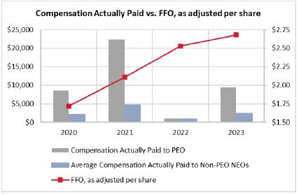 Our Chief Executive Officer is our principal executive officer ("PEO"). The following table details, for our PEO and our Non-PEO NEOs (on an average basis), total compensation as set forth in the Summary Compensation Table, "compensation actually paid" as determined under SEC rules, cumulative Total Shareholder Return ("TSR"), the cumulative TSR of our peer group, net income, and funds from operations ("FFO") per share, as adjusted, which is the most important financial performance measure that we use to link compensation to performance.
