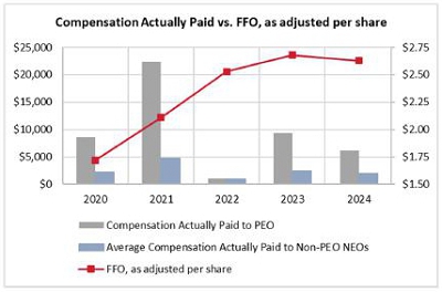 | NAMED EXECUTIVE OFFICER COMPENSATION 2024 Executive Compensation Program The Compensation Committee engaged FW Cook, an independent compensation consultant, to review our existing compensation and benefits program, analyze competitive market compensation practices, and make recommendations on our 2024 executive compensation program to achieve the objectives described above. Representatives of FW Cook were present at several of the Compensation Committee’s meetings and also met with the Compensation Committee in executive session, where no members of management were present. As part of its process of designing and evaluating the competitiveness of our compensation program, the Compensation Committee, after considering the input of FW Cook, identified a peer group of companies for purposes of competitive market comparisons. This peer group is comprised of equity REITs with comparable market capitalizations and who, therefore, compete for executive talent with us. The Compensation Committee reviewed and discussed the compensation data compiled by FW Cook related to this peer group. After considering this data, the desire to retain a superior executive management team, and the tenure and caliber of our NEOs, the Compensation Committee established the 2024 compensation program. 34 |