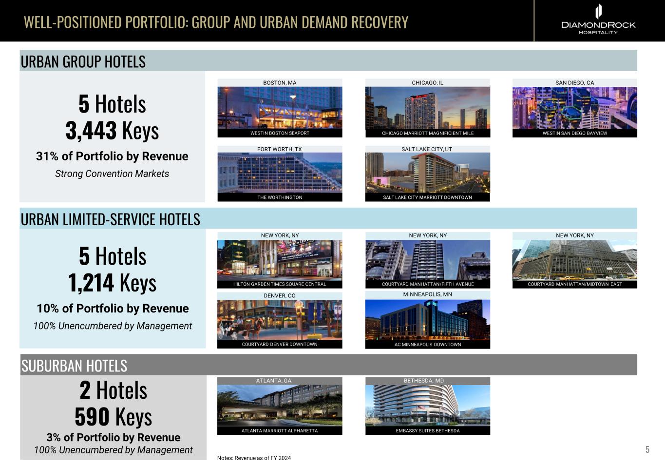 FORWARD LOOKING STATEMENTS & USE OF NON-GAAP FINANCIAL MEASURES FORWARD LOOKING STATEMENTS Certain statements made during this presentation are forward-looking statements that are subject to risks and uncertainties. Forward-looking statements generally include the words “believe,” “expect,” “anticipate,” “plan,” “estimate,” “project,” “will,” “intend” or other similar expressions. Forward-looking statements include, without limitation, statements regarding industry outlook, results of operations, cash flows, business strategies, growth and value opportunities, capital and other expenditures, financing plans, expense reduction initiatives and projected dispositions. Factors that could cause actual results to materially differ from those contained in the forward-looking statements include, without limitation, national and local economic and business conditions, including any future pandemic, epidemic or outbreak of any highly infectious disease on the U.S. that may impact DiamondRock Hospitality Company’s (the "Company“) hotels and the demand for hotel products and services, and those risks and uncertainties discussed in the most recent Annual Report on Form 10-K, which the Company has filed with the Securities and Exchange Commission, and in our other public filings which you should carefully review. The forward-looking statements made are based on our beliefs, assumptions and expectations of future performance, taking into account all information currently available to the Company. Actual results could differ materially from the forward- looking statements made in this presentation. The forward-looking statements made in this presentation are subject to the safe harbor of the Private Securities Litigation Reform Act of 1995. Any forward-looking statement speaks only as of the date on which it is made. Although the Company believes the expectations reflect ed in such forward-looking statements are based upon reasonable assumptions, it can give no assurance that the expectations will be attained or that any deviation will not be material. All information in this presentation is as of the date of this presentation, and the Company undertakes no obligation to update any forward-looking statement to conform the statement to actual results or changes in the Company’s expectations. This presentation contains statistics and other data that has been obtained or compiled from information made available by third- party service providers and believed to be reliable, but the accuracy and completeness of the information is not assured. The Company has not independently verified any such information. USE OF NON-GAAP FINANCIAL MEASURES We use the following non-GAAP financial measures that we believe are useful to investors as key measures of our operating performance: EBITDA, EBITDAre, Adjusted EBITDA, Hotel EBITDA, Hotel Adjusted EBITDA, FFO and Adjusted FFO. These measures should not be considered in isolation or as a substitute for measures of performance in accordance with U.S. GAAP. EBITDA, EBITDAre, Adjusted EBITDA, Hotel EBITDA, Hotel Adjusted EBITDA, FFO and Adjusted FFO, as calculated by us, may not be comparable to other companies that do not define such terms exactly as the Company. A detailed explanation of these non-GAAP financial measures and the reconciliation of such measures to the most directly comparable financial measures prepared in accordance with U.S. GAAP can be found in the Company’s third quarter 2024 earnings press release dated February 27, 2025. 2