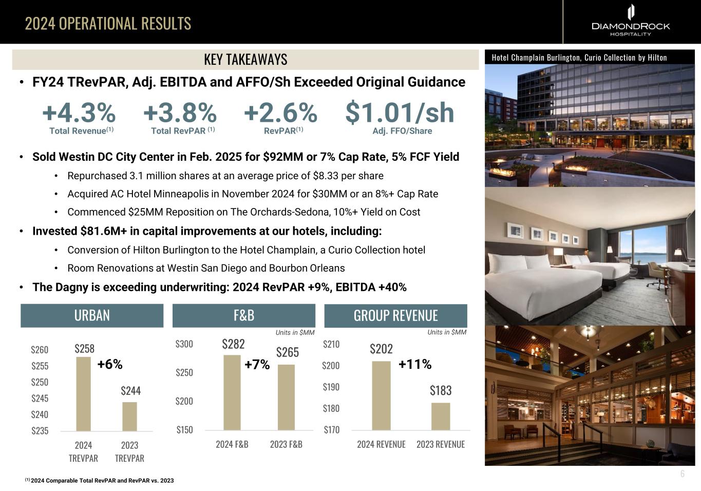 COURTYARD MANHATTAN/FIFTH AVENUE COURTYARD MANHATTAN/MIDTOWN EASTHILTON GARDEN TIMES SQUARE CENTRAL 5 Hotels 1,214 Keys 10% of Portfolio by Revenue 100% Unencumbered by Management WELL-POSITIONED PORTFOLIO: GROUP AND URBAN DEMAND RECOVERY 5 Hotels 3,443 Keys 31% of Portfolio by Revenue Strong Convention Markets 2 Hotels 590 Keys 3% of Portfolio by Revenue 100% Unencumbered by Management THE WORTHINGTON SALT LAKE CITY MARRIOTT DOWNTOWN EMBASSY SUITES BETHESDAATLANTA MARRIOTT ALPHARETTA URBAN GROUP HOTELS URBAN LIMITED-SERVICE HOTELS SUBURBAN HOTELS CHICAGO, ILBOSTON, MA BETHESDA, MDATLANTA, GA NEW YORK, NYNEW YORK, NYNEW YORK, NY Notes: Revenue as of FY 2024 5 DENVER, CO COURTYARD DENVER DOWNTOWN SAN DIEGO, CA FORT WORTH, TX SALT LAKE CITY, UT CHICAGO MARRIOTT MAGNIFICIENT MILEWESTIN BOSTON SEAPORT WESTIN SAN DIEGO BAYVIEW MINNEAPOLIS, MN AC MINNEAPOLIS DOWNTOWN