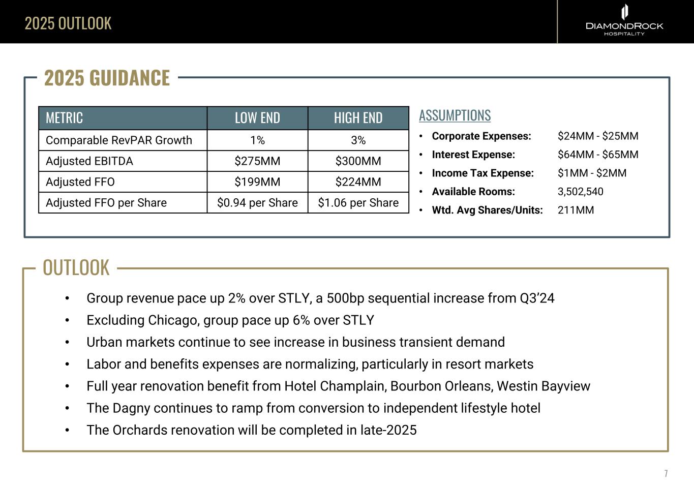 2024 OPERATIONAL RESULTS KEY TAKEAWAYS Hotel Champlain Burlington, Curio Collection by Hilton • Sold Westin DC City Center in Feb. 2025 for $92MM or 7% Cap Rate, 5% FCF Yield • Repurchased 3.1 million shares at an average price of $8.33 per share • Acquired AC Hotel Minneapolis in November 2024 for $30MM or an 8%+ Cap Rate • Commenced $25MM Reposition on The Orchards-Sedona, 10%+ Yield on Cost • Invested $81.6M+ in capital improvements at our hotels, including: • Conversion of Hilton Burlington to the Hotel Champlain, a Curio Collection hotel • Room Renovations at Westin San Diego and Bourbon Orleans • The Dagny is exceeding underwriting: 2024 RevPAR +9%, EBITDA +40% 6 $258 $244 $235 $240 $245 $250 $255 $260 2024 TREVPAR 2023 TREVPAR URBAN Units in $MM F&B GROUP REVENUE Units in $MM $202 $183 $170 $180 $190 $200 $210 2024 REVENUE 2023 REVENUE • FY24 TRevPAR, Adj. EBITDA and AFFO/Sh Exceeded Original Guidance +4.3% +2.6% $1.01/sh Total Revenue(1) RevPAR(1) Adj. FFO/Share +11%+6% (1) 2024 Comparable Total RevPAR and RevPAR vs. 2023 +3.8% Total RevPAR (1) $282 $265 $150 $200 $250 $300 2024 F&B 2023 F&B +7%