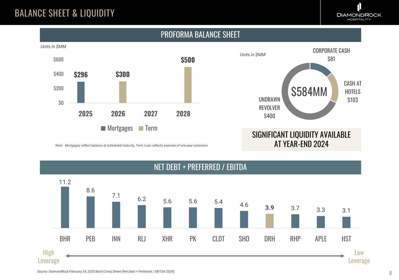 PROFORMA BALANCE SHEET BALANCE SHEET & LIQUIDITY Note: Mortgages reflect balance at scheduled maturity, Term Loan reflects exercise of one-year extension SIGNIFICANT LIQUIDITY AVAILABLE AT YEAR-END 2024 Units in $MM 8 NET DEBT + PREFERRED / EBITDA Source: DiamondRock February 24, 2025 Baird Comp Sheet (Net Debt + Preferred / EBITDA 2024) Low Leverage High Leverage CORPORATE CASH $81 CASH AT HOTELS $103UNDRAWN REVOLVER $400 $584MM $296 $300 $500 $0 $200 $400 $600 2025 2026 2027 2028 Mortgages Term Units in $MM 11.2 8.6 7.1 6.2 5.6 5.6 5.4 4.6 3.9 3.7 3.3 3.1 BHR PEB INN RLJ XHR PK CLDT SHO DRH RHP APLE HST