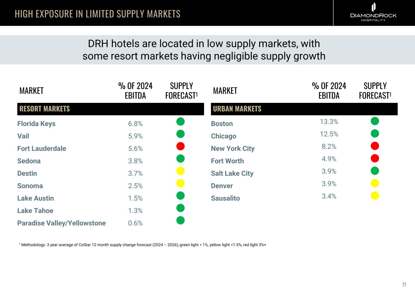 HIGH EXPOSURE IN LIMITED SUPPLY MARKETS 1 Methodology: 3 year average of CoStar 12 month supply change forecast (2024 – 2026); green light < 1%, yellow light <1-3%, red light 3%+ MARKET % OF 2024 EBITDA SUPPLY FORECAST1 RESORT MARKETS Florida Keys 6.8% Vail 5.9% Fort Lauderdale 5.6% Sedona 3.8% Destin 3.7% Sonoma 2.5% Lake Austin 1.5% Lake Tahoe 1.3% Paradise Valley/Yellowstone 0.6% DRH hotels are located in low supply markets, with some resort markets having negligible supply growth MARKET % OF 2024 EBITDA SUPPLY FORECAST1 URBAN MARKETS Boston 13.3% Chicago 12.5% New York City 8.2% Fort Worth 4.9% Salt Lake City 3.9% Denver 3.9% Sausalito 3.4% 11
