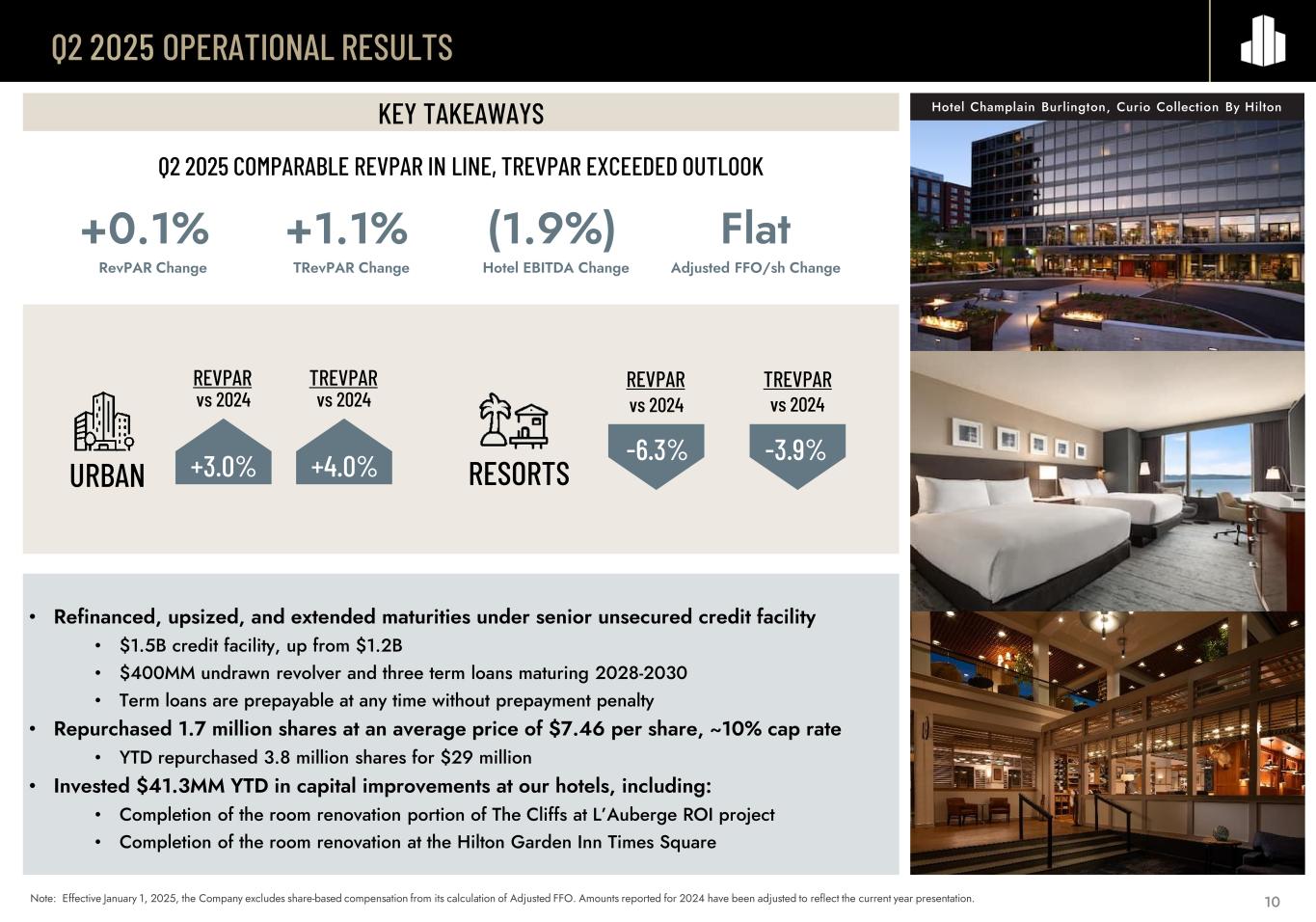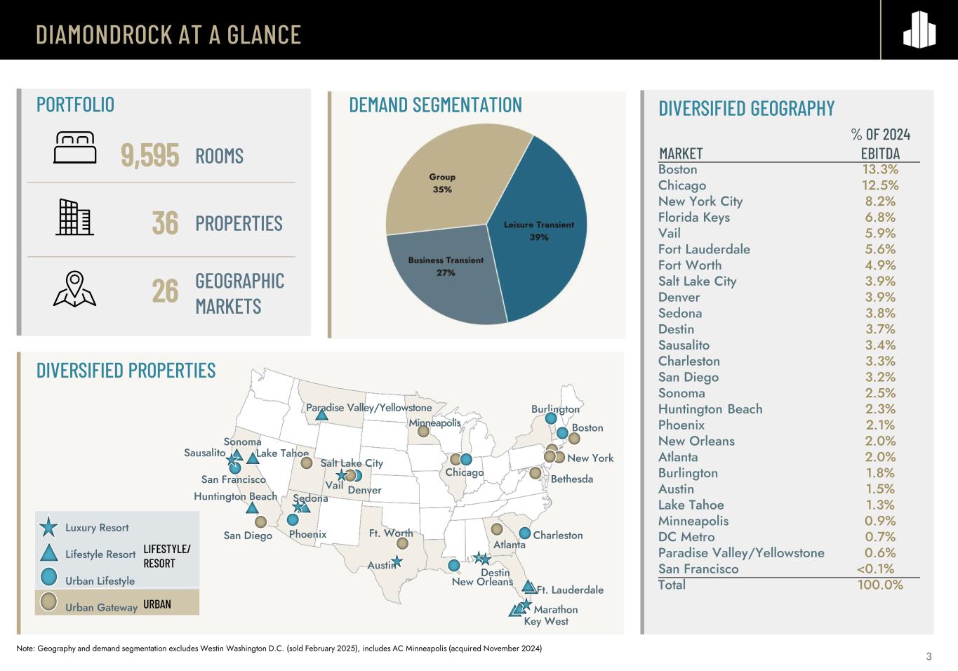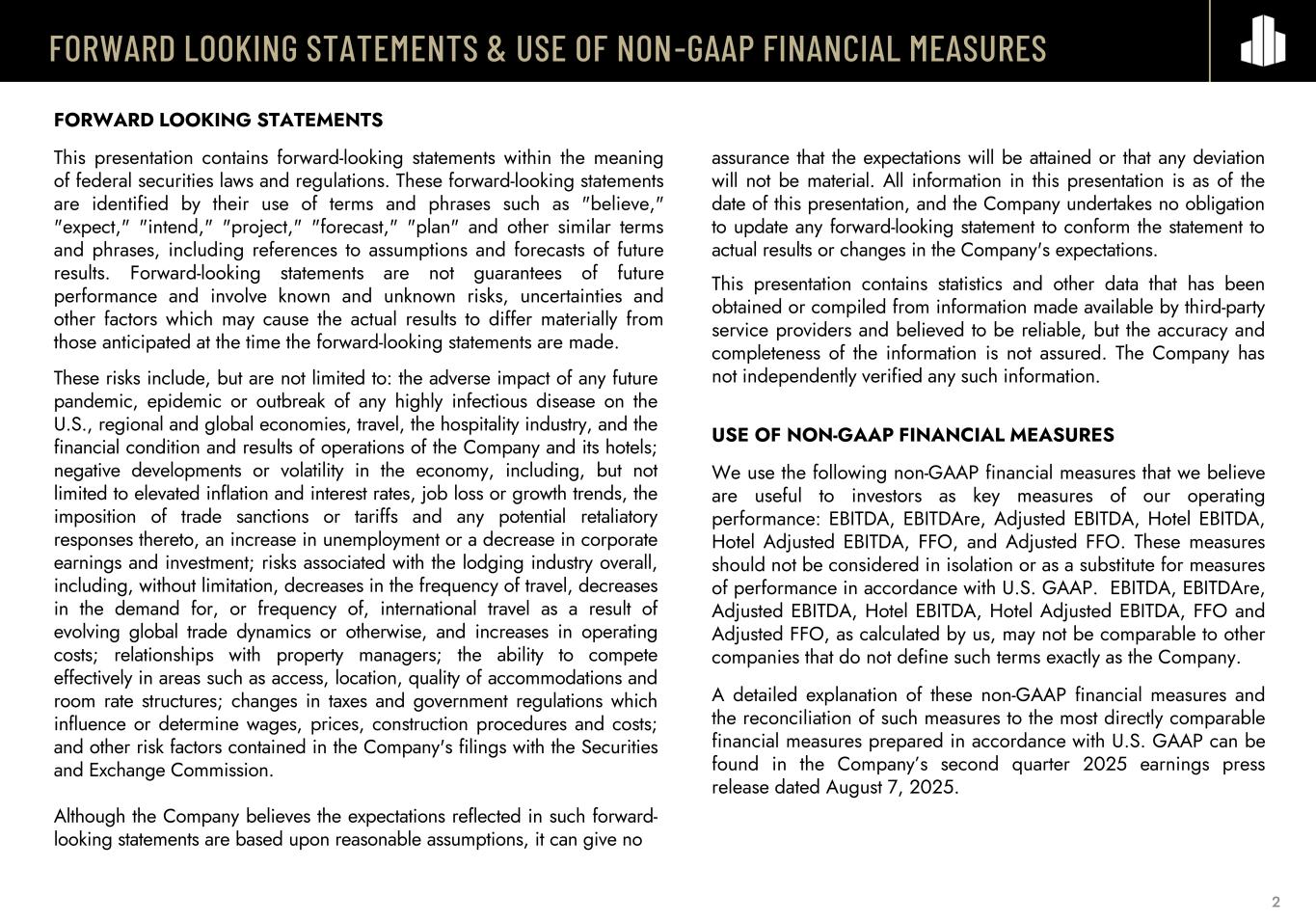 FORWARD LOOKING STATEMENTS & USE OF NON-GAAP FINANCIAL MEASURES 2 FORWARD LOOKING STATEMENTS This presentation contains forward-looking statements within the meaning of federal securities laws and regulations. These forward-looking statements are identified by their use of terms and phrases such as "believe," "expect," "intend," "project," "forecast," "plan" and other similar terms and phrases, including references to assumptions and forecasts of future results. Forward-looking statements are not guarantees of future performance and involve known and unknown risks, uncertainties and other factors which may cause the actual results to differ materially from those anticipated at the time the forward-looking statements are made. These risks include, but are not limited to: the adverse impact of any future pandemic, epidemic or outbreak of any highly infectious disease on the U.S., regional and global economies, travel, the hospitality industry, and the financial condition and results of operations of the Company and its hotels; negative developments or volatility in the economy, including, but not limited to elevated inflation and interest rates, job loss or growth trends, the imposition of trade sanctions or tariffs and any potential retaliatory responses thereto, an increase in unemployment or a decrease in corporate earnings and investment; risks associated with the lodging industry overall, including, without limitation, decreases in the frequency of travel, decreases in the demand for, or frequency of, international travel as a result of evolving global trade dynamics or otherwise, and increases in operating costs; relationships with property managers; the ability to compete effectively in areas such as access, location, quality of accommodations and room rate structures; changes in taxes and government regulations which influence or determine wages, prices, construction procedures and costs; and other risk factors contained in the Company's filings with the Securities and Exchange Commission. Although the Company believes the expectations reflected in such forward- looking statements are based upon reasonable assumptions, it can give no assurance that the expectations will be attained or that any deviation will not be material. All information in this presentation is as of the date of this presentation, and the Company undertakes no obligation to update any forward-looking statement to conform the statement to actual results or changes in the Company's expectations. This presentation contains statistics and other data that has been obtained or compiled from information made available by third-party service providers and believed to be reliable, but the accuracy and completeness of the information is not assured. The Company has not independently verified any such information. USE OF NON-GAAP FINANCIAL MEASURES We use the following non-GAAP financial measures that we believe are useful to investors as key measures of our operating performance: EBITDA, EBITDAre, Adjusted EBITDA, Hotel EBITDA, Hotel Adjusted EBITDA, FFO, and Adjusted FFO. These measures should not be considered in isolation or as a substitute for measures of performance in accordance with U.S. GAAP. EBITDA, EBITDAre, Adjusted EBITDA, Hotel EBITDA, Hotel Adjusted EBITDA, FFO and Adjusted FFO, as calculated by us, may not be comparable to other companies that do not define such terms exactly as the Company. A detailed explanation of these non-GAAP financial measures and the reconciliation of such measures to the most directly comparable financial measures prepared in accordance with U.S. GAAP can be found in the Company’s second quarter 2025 earnings press release dated August 7, 2025.