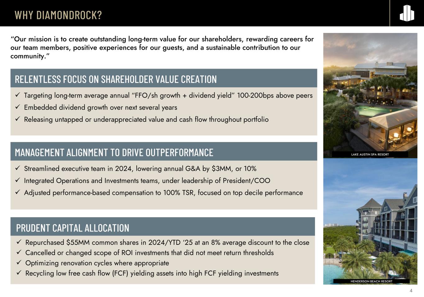 DIAMONDROCK AT A GLANCE DIVERSIFIED PROPERTIES 9,595 36 26 ROOMS GEOGRAPHIC MARKETS PROPERTIES MARKET % OF 2024 EBITDA Boston 13.3% Chicago 12.5% New York City 8.2% Florida Keys 6.8% Vail 5.9% Fort Lauderdale 5.6% Fort Worth 4.9% Salt Lake City 3.9% Denver 3.9% Sedona 3.8% Destin 3.7% Sausalito 3.4% Charleston 3.3% San Diego 3.2% Sonoma 2.5% Huntington Beach 2.3% Phoenix 2.1% New Orleans 2.0% Atlanta 2.0% Burlington 1.8% Austin 1.5% Lake Tahoe 1.3% Minneapolis 0.9% DC Metro 0.7% Paradise Valley/Yellowstone 0.6% San Francisco <0.1% Total 100.0% Luxury Resort Lifestyle Resort Urban Lifestyle Urban Gateway LIFESTYLE/ RESORT URBAN Boston Ft. Worth Ft. Lauderdale Chicago Vail Sausalito Salt Lake City San Diego Key West Sonoma Burlington Phoenix Denver Destin Atlanta Huntington Beach Charleston New Orleans San Francisco Lake Tahoe Sedona New York Austin Paradise Valley/Yellowstone Marathon Minneapolis Bethesda Note: Geography and demand segmentation excludes Westin Washington D.C. (sold February 2025), includes AC Minneapolis (acquired November 2024) DIVERSIFIED GEOGRAPHYDEMAND SEGMENTATIONPORTFOLIO 3