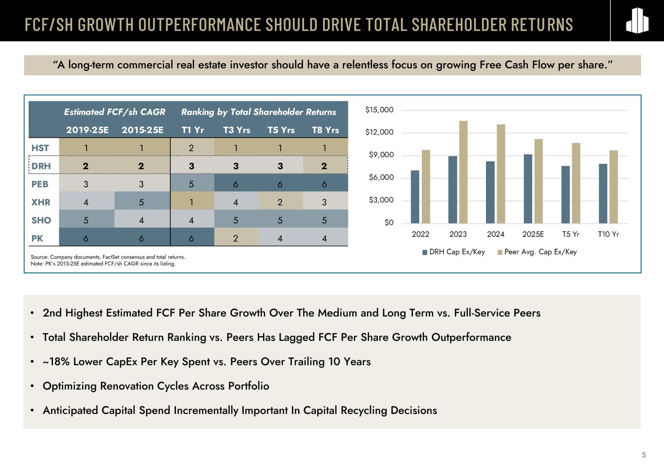 WHY DIAMONDROCK? “Our mission is to create outstanding long-term value for our shareholders, rewarding careers for our team members, positive experiences for our guests, and a sustainable contribution to our community.” PRUDENT CAPITAL ALLOCATION ✓ Repurchased $55MM common shares in 2024/YTD ‘25 at an 8% average discount to the close ✓ Cancelled or changed scope of ROI investments that did not meet return thresholds ✓ Optimizing renovation cycles where appropriate ✓ Recycling low free cash flow (FCF) yielding assets into high FCF yielding investments 4 RELENTLESS FOCUS ON SHAREHOLDER VALUE CREATION ✓ Targeting long-term average annual “FFO/sh growth + dividend yield” 100-200bps above peers ✓ Embedded dividend growth over next several years ✓ Releasing untapped or underappreciated value and cash flow throughout portfolio MANAGEMENT ALIGNMENT TO DRIVE OUTPERFORMANCE ✓ Streamlined executive team in 2024, lowering annual G&A by $3MM, or 10% ✓ Integrated Operations and Investments teams, under leadership of President/COO ✓ Adjusted performance-based compensation to 100% TSR, focused on top decile performance LAKE AUSTIN SPA RESORT HENDERSON BEACH RESORT