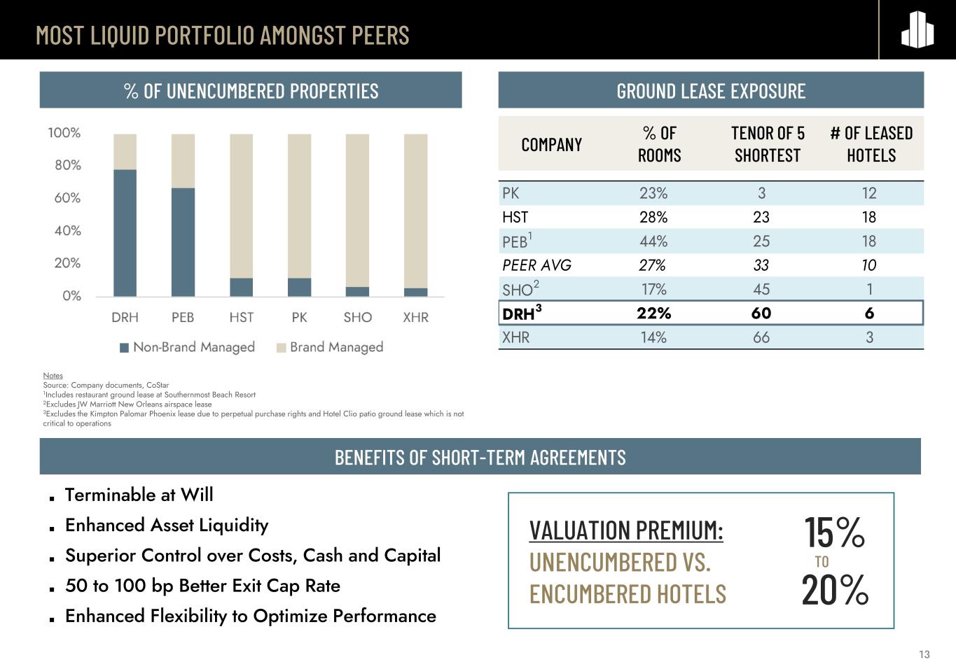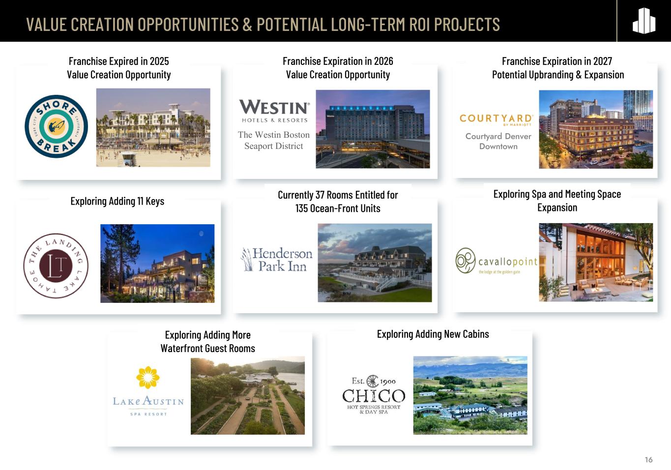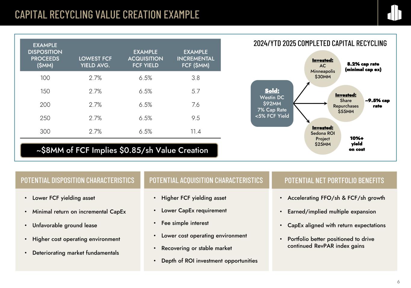 CAPITAL RECYCLING VALUE CREATION EXAMPLE POTENTIAL DISPOSITION CHARACTERISTICS POTENTIAL ACQUISITION CHARACTERISTICS POTENTIAL NET PORTFOLIO BENEFITS • Lower FCF yielding asset • Minimal return on incremental CapEx • Unfavorable ground lease • Higher cost operating environment • Deteriorating market fundamentals • Higher FCF yielding asset • Lower CapEx requirement • Fee simple interest • Lower cost operating environment • Recovering or stable market • Depth of ROI investment opportunities • Accelerating FFO/sh & FCF/sh growth • Earned/implied multiple expansion • CapEx aligned with return expectations • Portfolio better positioned to drive continued RevPAR index gains ~$8MM of FCF Implies $0.85/sh Value Creation 2024/YTD 2025 COMPLETED CAPITAL RECYCLING 8.2% cap rate (minimal cap ex) Invested: AC Minneapolis $30MM Invested: Share Repurchases $55MM Invested: Sedona ROI Project $25MM ~9.5% cap rate 10%+ yield on cost Sold: Westin DC $92MM 7% Cap Rate <5% FCF Yield 6