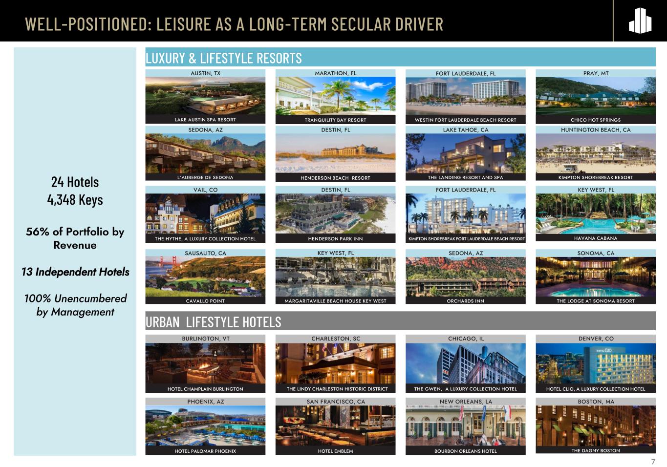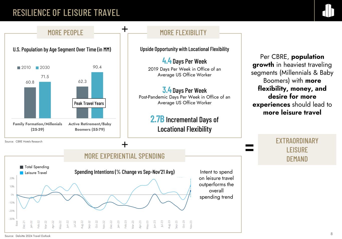 24 Hotels 4,348 Keys 56% of Portfolio by Revenue 13 Independent Hotels 100% Unencumbered by Management WELL-POSITIONED: LEISURE AS A LONG-TERM SECULAR DRIVER LUXURY & LIFESTYLE RESORTS URBAN LIFESTYLE HOTELS SAUSALITO, CA L’AUBERGE DE SEDONA THE LANDING RESORT AND SPA SEDONA, AZ SONOMA, CA HAVANA CABANA KIMPTON SHOREBREAK RESORT BURLINGTON, VT CHARLESTON, SC THE LINDY CHARLESTON HISTORIC DISTRICT CHICAGO, IL THE GWEN, A LUXURY COLLECTION HOTEL SAN FRANCISCO, CAPHOENIX, AZ NEW ORLEANS, LA HOTEL CLIO, A LUXURY COLLECTION HOTELHOTEL CHAMPLAIN BURLINGTON BOSTON, MA DENVER, CO HENDERSON BEACH RESORT LAKE AUSTIN SPA RESORT WESTIN FORT LAUDERDALE BEACH RESORT MARGARITAVILLE BEACH HOUSE KEY WEST TRANQUILITY BAY RESORT MARATHON, FLAUSTIN, TX FORT LAUDERDALE, FL KEY WEST, FL DESTIN, FLSEDONA, AZ LAKE TAHOE, CA HUNTINGTON BEACH, CA VAIL, CO DESTIN, FL FORT LAUDERDALE, FL KEY WEST, FL THE HYTHE, A LUXURY COLLECTION HOTEL HENDERSON PARK INN KIMPTON SHOREBREAK FORT LAUDERDALE BEACH RESORT CAVALLO POINT ORCHARDS INN THE LODGE AT SONOMA RESORT CHICO HOT SPRINGS HOTEL PALOMAR PHOENIX BOURBON ORLEANS HOTELHOTEL EMBLEM THE DAGNY BOSTON PRAY, MT 7