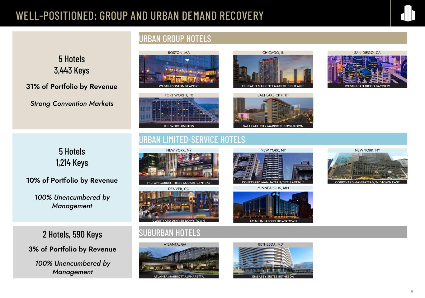 WELL-POSITIONED: GROUP AND URBAN DEMAND RECOVERY 9 COURTYARD MANHATTAN/FIFTH AVENUE COURTYARD MANHATTAN/MIDTOWN EASTHILTON GARDEN TIMES SQUARE CENTRAL 5 Hotels 1,214 Keys 10% of Portfolio by Revenue 100% Unencumbered by Management 5 Hotels 3,443 Keys 31% of Portfolio by Revenue Strong Convention Markets 2 Hotels, 590 Keys 3% of Portfolio by Revenue 100% Unencumbered by Management THE WORTHINGTON SALT LAKE CITY MARRIOTT DOWNTOWN EMBASSY SUITES BETHESDAATLANTA MARRIOTT ALPHARETTA URBAN GROUP HOTELS URBAN LIMITED-SERVICE HOTELS SUBURBAN HOTELS CHICAGO, ILBOSTON, MA BETHESDA, MDATLANTA, GA NEW YORK, NYNEW YORK, NYNEW YORK, NY DENVER, CO COURTYARD DENVER DOWNTOWN SAN DIEGO, CA FORT WORTH, TX SALT LAKE CITY, UT CHICAGO MARRIOTT MAGNIFICIENT MILEWESTIN BOSTON SEAPORT WESTIN SAN DIEGO BAYVIEW MINNEAPOLIS, MN AC MINNEAPOLIS DOWNTOWN