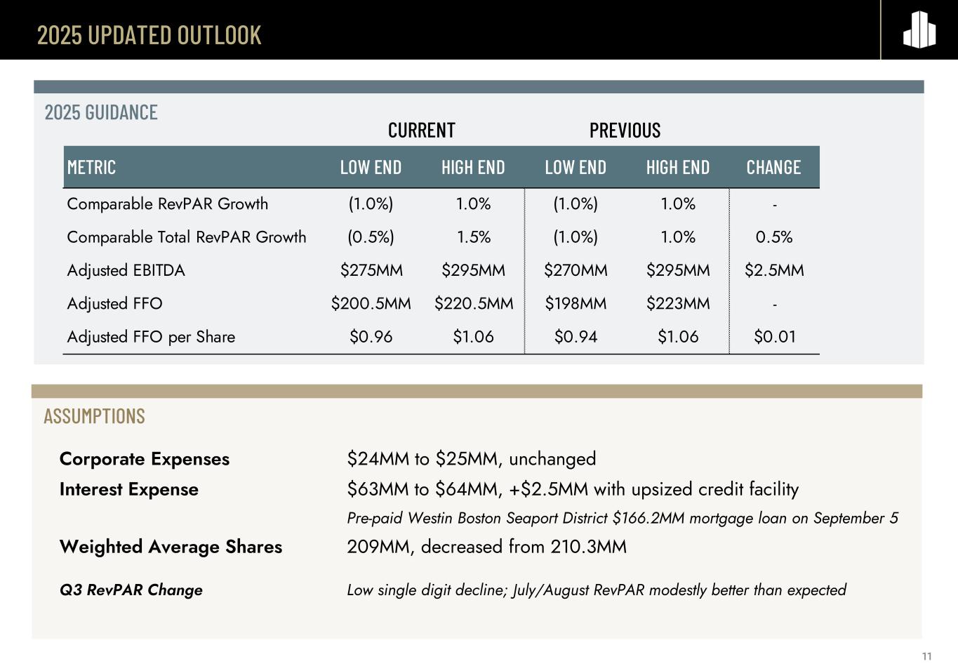 Q2 2025 OPERATIONAL RESULTS KEY TAKEAWAYS Hotel Champlain Burlington, Curio Collection By Hilton • Refinanced, upsized, and extended maturities under senior unsecured credit facility • $1.5B credit facility, up from $1.2B • $400MM undrawn revolver and three term loans maturing 2028-2030 • Term loans are prepayable at any time without prepayment penalty • Repurchased 1.7 million shares at an average price of $7.46 per share, ~10% cap rate • YTD repurchased 3.8 million shares for $29 million • Invested $41.3MM YTD in capital improvements at our hotels, including: • Completion of the room renovation portion of The Cliffs at L’Auberge ROI project • Completion of the room renovation at the Hilton Garden Inn Times Square Q2 2025 COMPARABLE REVPAR IN LINE, TREVPAR EXCEEDED OUTLOOK +0.1% (1.9%) Flat RevPAR Change Hotel EBITDA Change Adjusted FFO/sh Change +1.1% TRevPAR Change URBAN RESORTS -6.3% -3.9%+4.0%+3.0% REVPAR TREVPAR vs 2024vs 2024 REVPAR TREVPAR vs 2024 vs 2024 10Note: Effective January 1, 2025, the Company excludes share-based compensation from its calculation of Adjusted FFO. Amounts reported for 2024 have been adjusted to reflect the current year presentation.