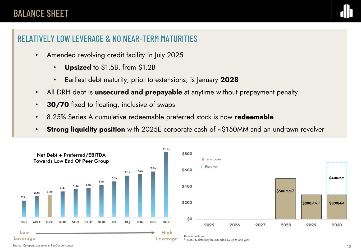 2025 UPDATED OUTLOOK ASSUMPTIONS CURRENT Corporate Expenses $24MM to $25MM, unchanged Interest Expense $63MM to $64MM, +$2.5MM with upsized credit facility Pre-paid Westin Boston Seaport District $166.2MM mortgage loan on September 5 Weighted Average Shares 209MM, decreased from 210.3MM Q3 RevPAR Change Low single digit decline; July/August RevPAR modestly better than expected 2025 GUIDANCE PREVIOUS 11 METRIC LOW END HIGH END LOW END HIGH END CHANGE Comparable RevPAR Growth (1.0%) 1.0% (1.0%) 1.0% - Comparable Total RevPAR Growth (0.5%) 1.5% (1.0%) 1.0% 0.5% Adjusted EBITDA $275MM $295MM $270MM $295MM $2.5MM Adjusted FFO $200.5MM $220.5MM $198MM $223MM - Adjusted FFO per Share $0.96 $1.06 $0.94 $1.06 $0.01