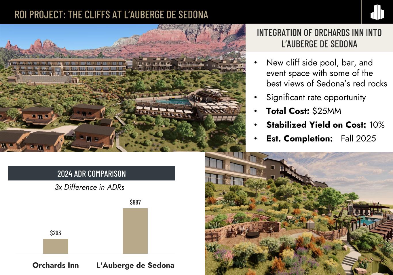 ROI PROJECT: THE CLIFFS AT L’AUBERGE DE SEDONA 14 INTEGRATION OF ORCHARDS INN INTO L’AUBERGE DE SEDONA • New cliff side pool, bar, and event space with some of the best views of Sedona’s red rocks • Significant rate opportunity • Total Cost: $25MM • Stabilized Yield on Cost: 10% • Est. Completion: Fall 2025 2024 ADR COMPARISON 3x Difference in ADRs $293 $887 Orchards Inn L'Auberge de Sedona
