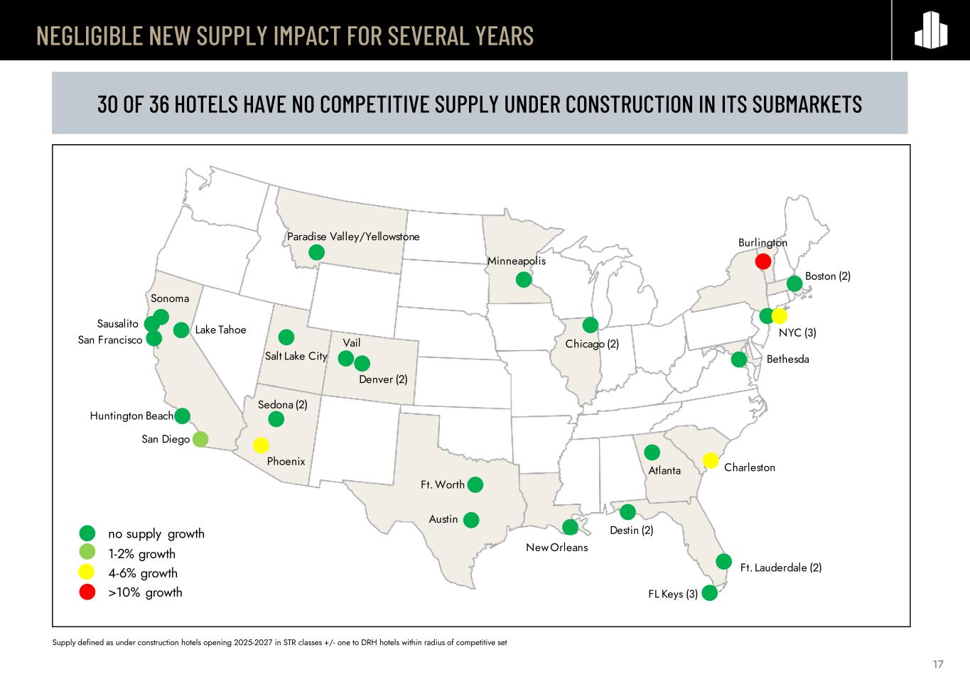 VALUE CREATION OPPORTUNITIES & POTENTIAL LONG-TERM ROI PROJECTS Courtyard Denver Downtown The Westin Boston Seaport District Exploring Adding More Waterfront Guest Rooms Franchise Expiration in 2027 Potential Upbranding & Expansion Franchise Expiration in 2026 Value Creation Opportunity Currently 37 Rooms Entitled for 135 Ocean-Front Units Exploring Adding 11 Keys Franchise Expired in 2025 Value Creation Opportunity Exploring Adding New Cabins Exploring Spa and Meeting Space Expansion 16