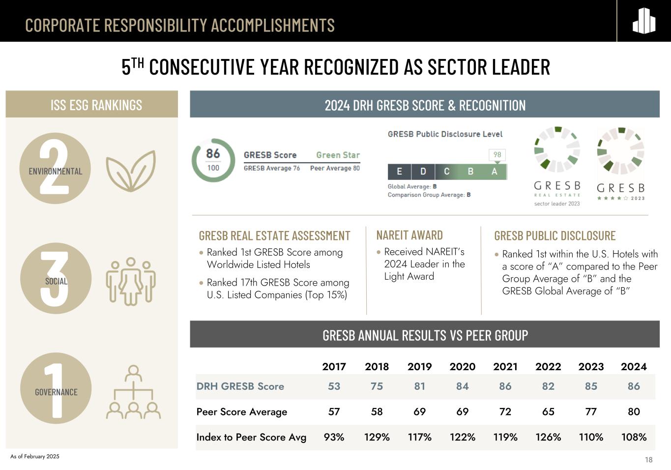 CORPORATE RESPONSIBILITY ACCOMPLISHMENTS GRESB ANNUAL RESULTS VS PEER GROUP 2017 2018 2019 2020 2021 2022 2023 2024 DRH GRESB Score 53 75 81 84 86 82 85 86 Peer Score Average 57 58 69 69 72 65 77 80 Index to Peer Score Avg 93% 129% 117% 122% 119% 126% 110% 108% 2024 DRH GRESB SCORE & RECOGNITION 5TH CONSECUTIVE YEAR RECOGNIZED AS SECTOR LEADER GRESB REAL ESTATE ASSESSMENT • Ranked 1st GRESB Score among Worldwide Listed Hotels • Ranked 17th GRESB Score among U.S. Listed Companies (Top 15%) GRESB PUBLIC DISCLOSURE • Ranked 1st within the U.S. Hotels with a score of “A” compared to the Peer Group Average of “B” and the GRESB Global Average of “B” ISS ESG RANKINGS 2ENVIRONMENTAL 3SOCIAL 1GOVERNANCE As of February 2025 NAREIT AWARD • Received NAREIT’s 2024 Leader in the Light Award 18