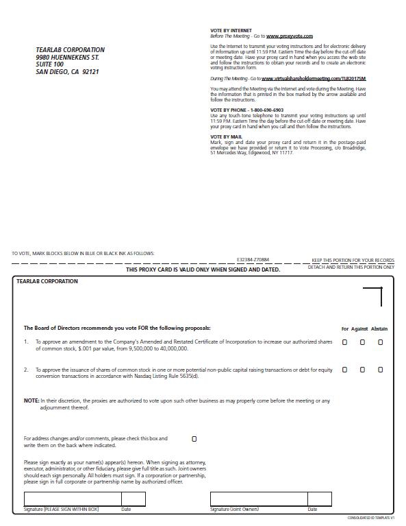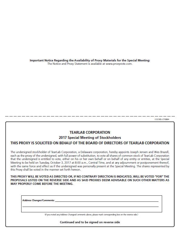 Notice is hereby given that a Special Meeting of the Stockholders (with any amendments, postponements or adjournments thereof, the “Special Meeting”) of TearLab Corporation, a Delaware corporation (“TearLab” or the “Company”) will be held on October 3, 2017 at 8:00 a.m., Central Time, for the following purposes: