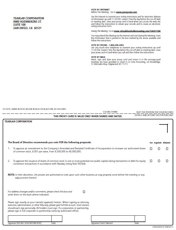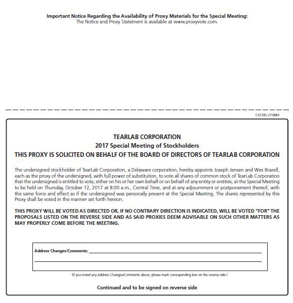 Notice is hereby given that a Special Meeting of the Stockholders (with any amendments, postponements or adjournments thereof, the “Special Meeting”) of TearLab Corporation, a Delaware corporation (“TearLab” or the “Company”) will be held on October 12, 2017 at 8:00 a.m., Central Time, for the following purposes: