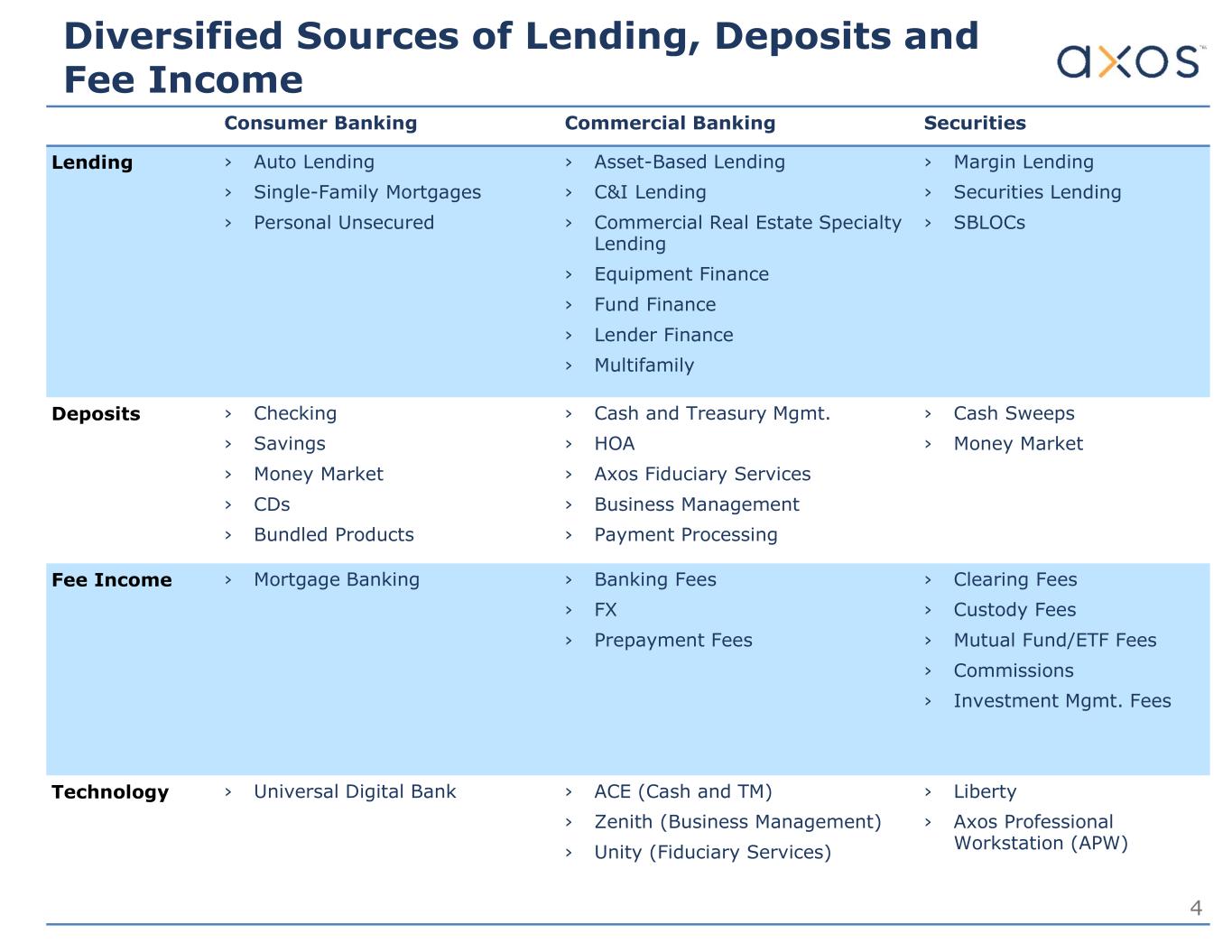 SecuritiesCommercial BankingConsumer Banking › Margin Lending › Securities Lending › SBLOCs › Asset-Based Lending › C&I Lending › Commercial Real Estate Specialty Lending › Equipment Finance › Fund Finance › Lender Finance › Multifamily › Auto Lending › Single-Family Mortgages › Personal Unsecured Lending › Cash Sweeps › Money Market › Cash and Treasury Mgmt. › HOA › Axos Fiduciary Services › Business Management › Payment Processing › Checking › Savings › Money Market › CDs › Bundled Products Deposits › Clearing Fees › Custody Fees › Mutual Fund/ETF Fees › Commissions › Investment Mgmt. Fees › Banking Fees › FX › Prepayment Fees › Mortgage BankingFee Income › Liberty › Axos Professional Workstation (APW) › ACE (Cash and TM) › Zenith (Business Management) › Unity (Fiduciary Services) › Universal Digital BankTechnology Diversified Sources of Lending, Deposits and Fee Income 4