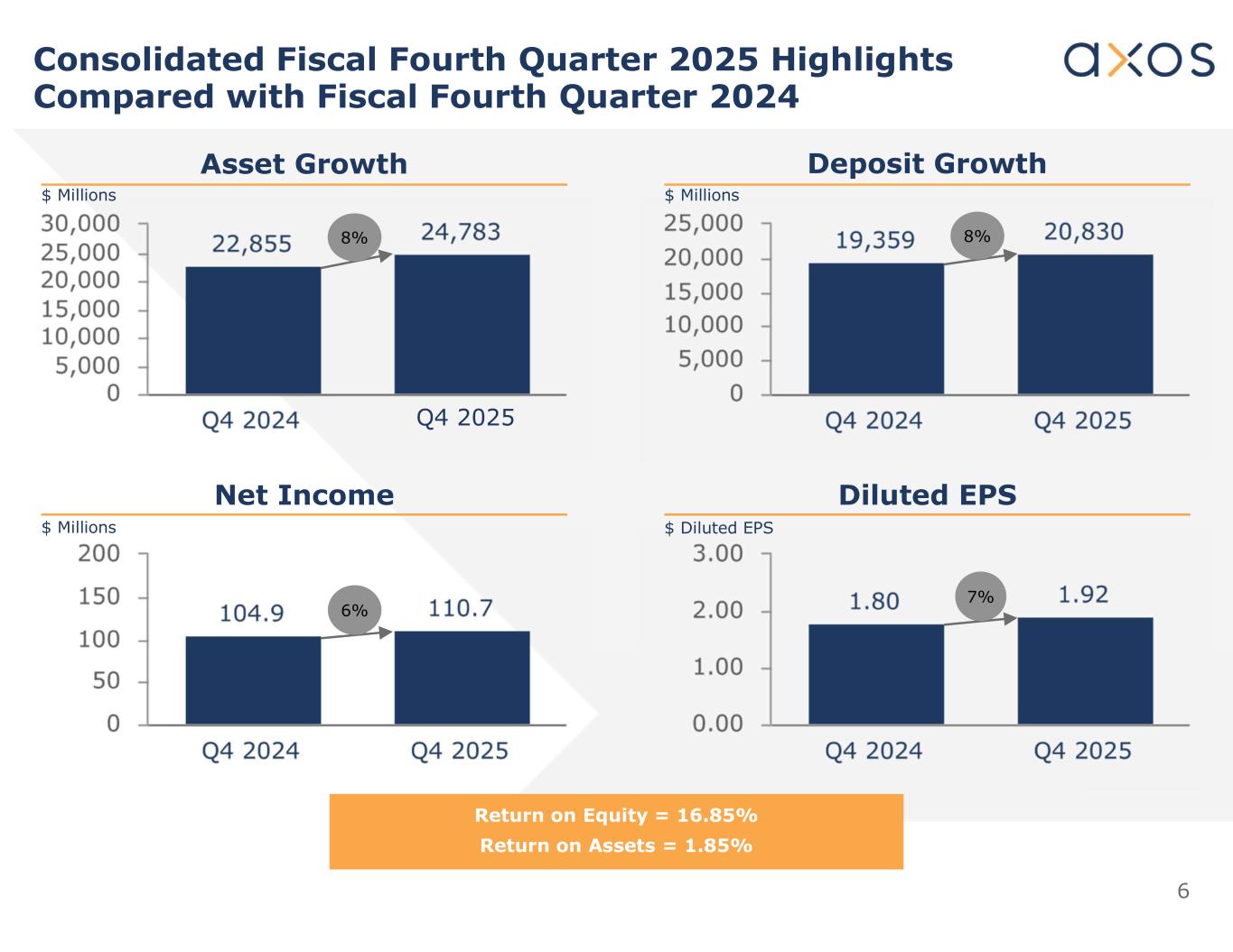 5 PercentilePeer Group1Axos Bank 89%0.69%1.55%ROAA 92%6.40%14.62%Return on Equity 30%2.41%2.09%NIE/Avg Assets 96%2.79%4.68%Net Interest Income 6%72.46%43.45%Efficiency Ratio Source: Uniform Bank Performance Report (UBPR) as of June 30, 2025; data retrieved July 30, 2025. Note 1: Peer group is all savings banks with assets greater than $1 billion for quarter ended June 30, 2025. Axos is a Top Performer Versus Bank Peer Group The 92% on ROE means that the Bank outperformed 92% of all banks. The 6% efficiency ratio ranking means that only 6% of banks have lower expenses in comparison to their revenues.