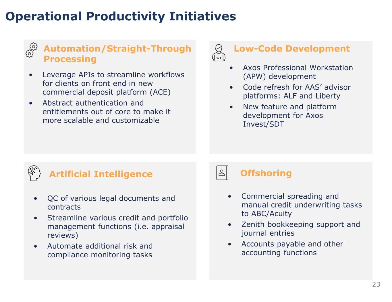23 Automation/Straight-Through Processing Low-Code Development Artificial Intelligence Offshoring • Axos Professional Workstation (APW) development • Code refresh for AAS’ advisor platforms: ALF and Liberty • New feature and platform development for Axos Invest/SDT • QC of various legal documents and contracts • Streamline various credit and portfolio management functions (i.e. appraisal reviews) • Automate additional risk and compliance monitoring tasks • Commercial spreading and manual credit underwriting tasks to ABC/Acuity • Zenith bookkeeping support and journal entries • Accounts payable and other accounting functions • Leverage APIs to streamline workflows for clients on front end in new commercial deposit platform (ACE) • Abstract authentication and entitlements out of core to make it more scalable and customizable Operational Productivity Initiatives