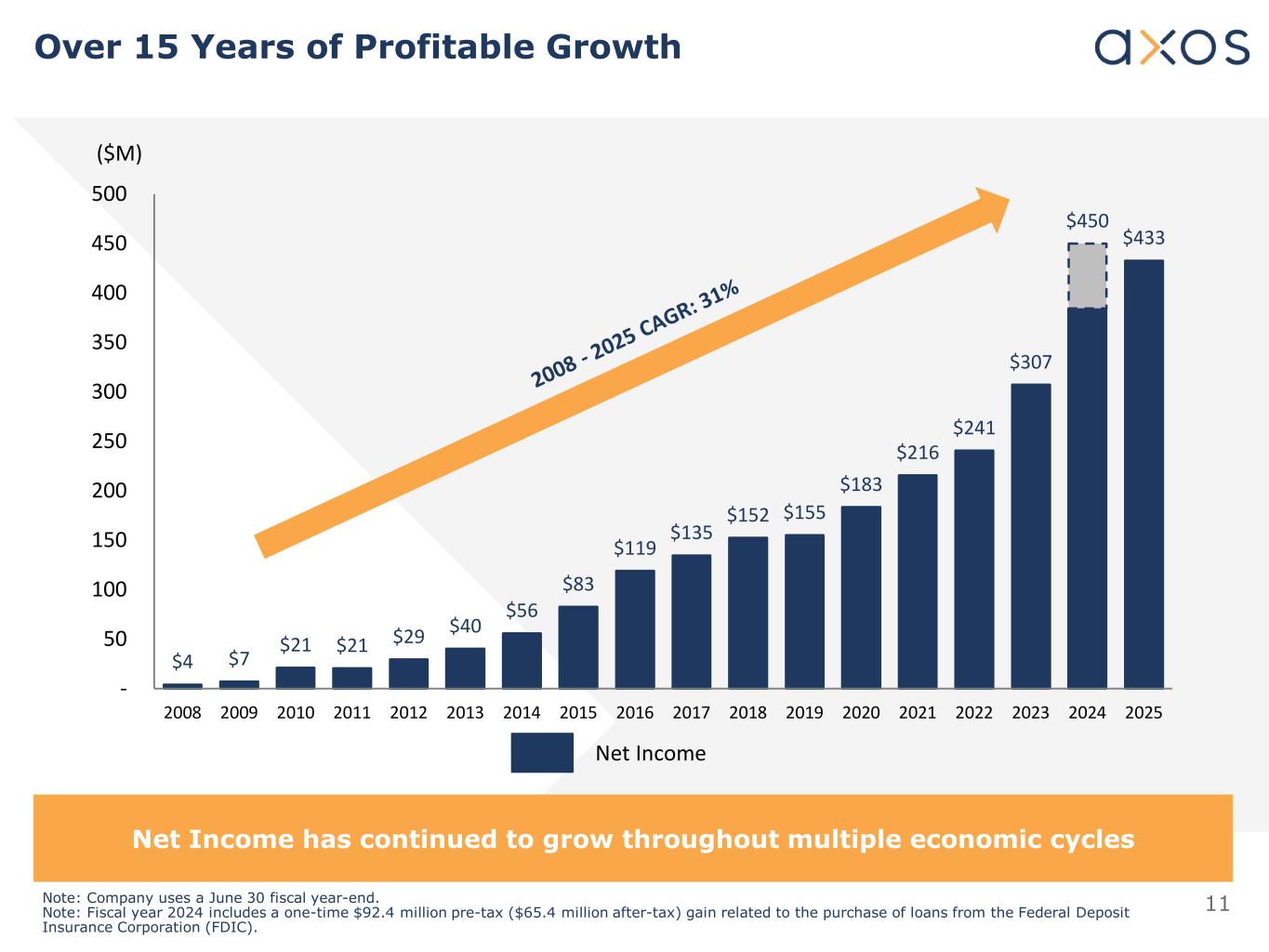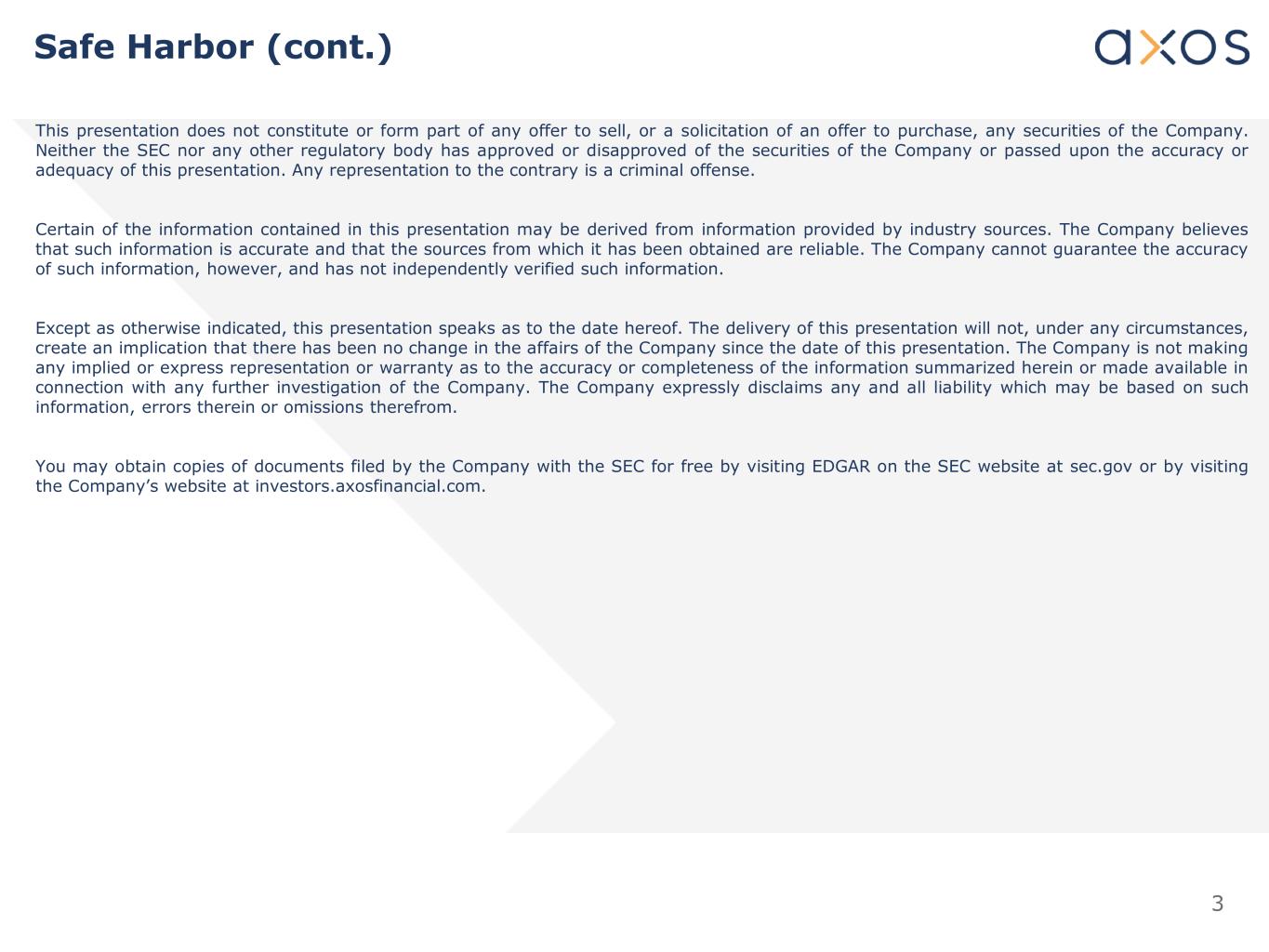 2 Safe Harbor This presentation contains forward-looking statements that involve risks and uncertainties, including without limitation statements relating to Axos Financial, Inc.’s (“Axos”) financial prospects and other projections of its performance and asset quality, Axos’ deposit balances and capital ratios, Axos’ ability to continue to grow profitably and increase its business, Axos’ ability to continue to diversify its lending and deposit franchises, the anticipated timing and financial performance of other offerings, initiatives, and acquisitions, expectations of the environment in which Axos operates and projections of future performance. These forward- looking statements are made on the basis of the views and assumptions of management regarding future events and performance as of the date of this presentation. Actual results and the timing of events could differ materially from those expressed or implied in such forward-looking statements as a result of risks and uncertainties, including without limitation Axos’ ability to successfully integrate acquisitions and realize the anticipated benefits of the transactions, changes in the interest rate environment, monetary policy, inflation, tariffs, government regulation, general economic conditions, changes in the competitive marketplace, conditions in the real estate markets in which we operate, risks associated with credit quality, our ability to attract and retain deposits and access other sources of liquidity, and the outcome and effects of litigation and other factors beyond our control. These and other risks and uncertainties detailed in Axos’ periodic reports filed with the Securities and Exchange Commission, including its Annual Report on Form 10-K for the fiscal year ended June 30, 2025,scould cause actual results to differ materially from those expressed or implied in any forward-looking statements. Readers are cautioned not to place undue reliance on these forward-looking statements, which speak only as of the date of this presentation. Axos undertakes no obligation to publicly update or revise any forward-looking statements, whether as a result of new information, future events or otherwise. All written and oral forward-looking statements made in connection with this presentation, which are attributable to us or persons acting on Axos’ behalf are expressly qualified in their entirety by the foregoing information.
