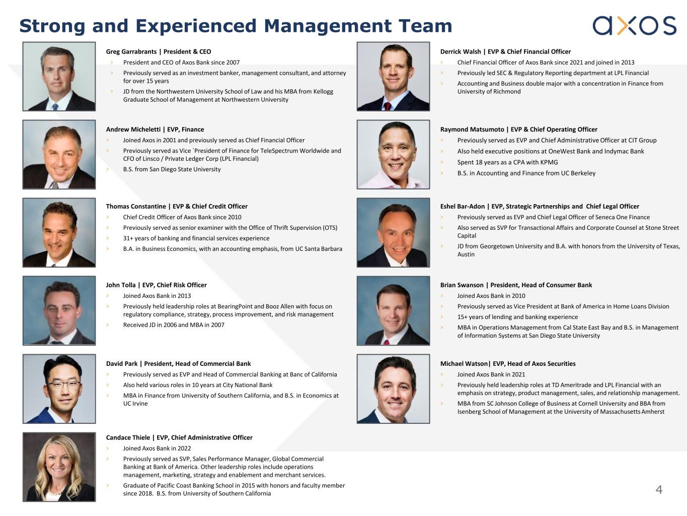 3 Safe Harbor (cont.) This presentation does not constitute or form part of any offer to sell, or a solicitation of an offer to purchase, any securities of the Company. Neither the SEC nor any other regulatory body has approved or disapproved of the securities of the Company or passed upon the accuracy or adequacy of this presentation. Any representation to the contrary is a criminal offense. Certain of the information contained in this presentation may be derived from information provided by industry sources. The Company believes that such information is accurate and that the sources from which it has been obtained are reliable. The Company cannot guarantee the accuracy of such information, however, and has not independently verified such information. Except as otherwise indicated, this presentation speaks as to the date hereof. The delivery of this presentation will not, under any circumstances, create an implication that there has been no change in the affairs of the Company since the date of this presentation. The Company is not making any implied or express representation or warranty as to the accuracy or completeness of the information summarized herein or made available in connection with any further investigation of the Company. The Company expressly disclaims any and all liability which may be based on such information, errors therein or omissions therefrom. You may obtain copies of documents filed by the Company with the SEC for free by visiting EDGAR on the SEC website at sec.gov or by visiting the Company’s website at investors.axosfinancial.com.