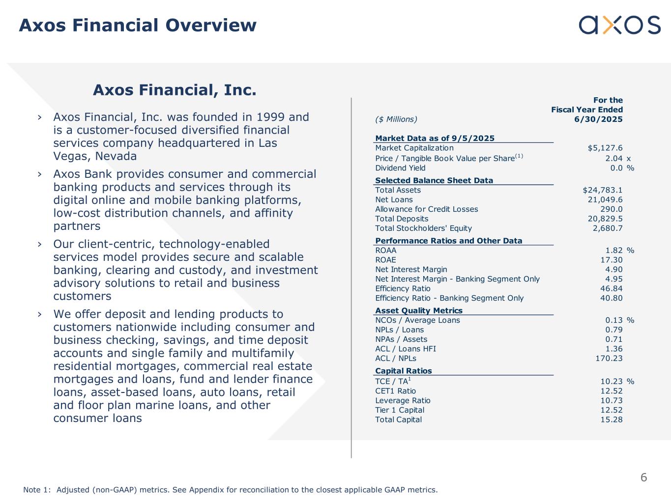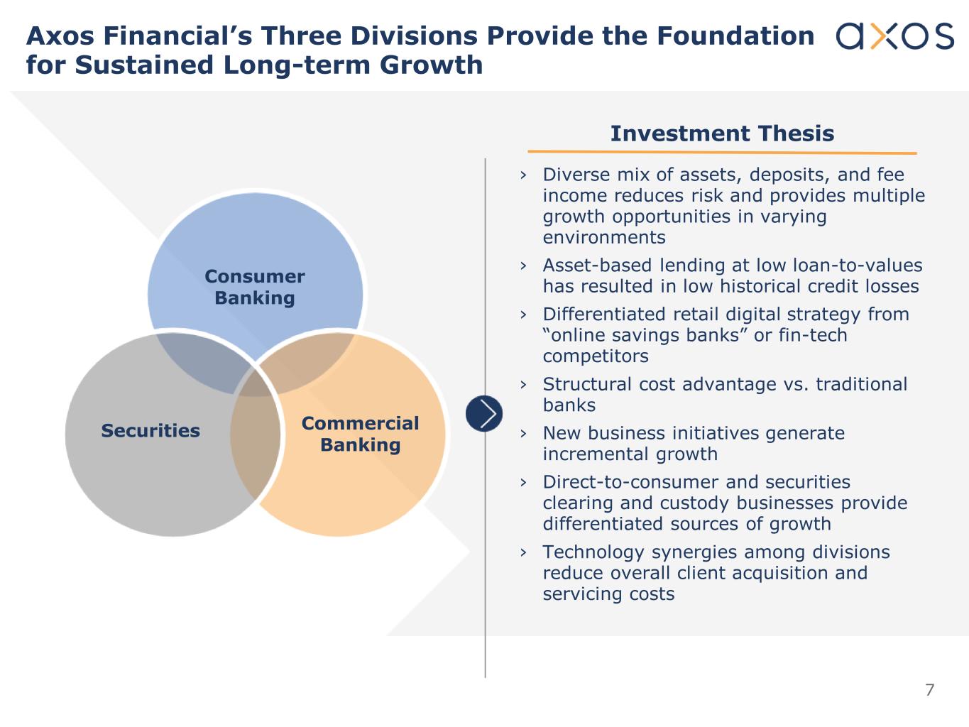 6 Axos Financial Overview Note 1: Adjusted (non-GAAP) metrics. See Appendix for reconciliation to the closest applicable GAAP metrics. For the Fiscal Year Ended ($ Millions) 6/30/2025 Market Data as of 9/5/2025 Market Capitalization $5,127.6 Price / Tangible Book Value per Share(1) 2.04 x Dividend Yield 0.0 % Selected Balance Sheet Data Total Assets $24,783.1 Net Loans 21,049.6 Allowance for Credit Losses 290.0 Total Deposits 20,829.5 Total Stockholders' Equity 2,680.7 Performance Ratios and Other Data ROAA 1.82 % ROAE 17.30 Net Interest Margin 4.90 Net Interest Margin - Banking Segment Only 4.95 Efficiency Ratio 46.84 Efficiency Ratio - Banking Segment Only 40.80 Asset Quality Metrics NCOs / Average Loans 0.13 % NPLs / Loans 0.79 NPAs / Assets 0.71 ACL / Loans HFI 1.36 ACL / NPLs 170.23 Capital Ratios TCE / TA1 10.23 % CET1 Ratio 12.52 Leverage Ratio 10.73 Tier 1 Capital 12.52 Total Capital 15.28 Axos Financial, Inc. › Axos Financial, Inc. was founded in 1999 and is a customer-focused diversified financial services company headquartered in Las Vegas, Nevada › Axos Bank provides consumer and commercial banking products and services through its digital online and mobile banking platforms, low-cost distribution channels, and affinity partners › Our client-centric, technology-enabled services model provides secure and scalable banking, clearing and custody, and investment advisory solutions to retail and business customers › We offer deposit and lending products to customers nationwide including consumer and business checking, savings, and time deposit accounts and single family and multifamily residential mortgages, commercial real estate mortgages and loans, fund and lender finance loans, asset-based loans, auto loans, retail and floor plan marine loans, and other consumer loans