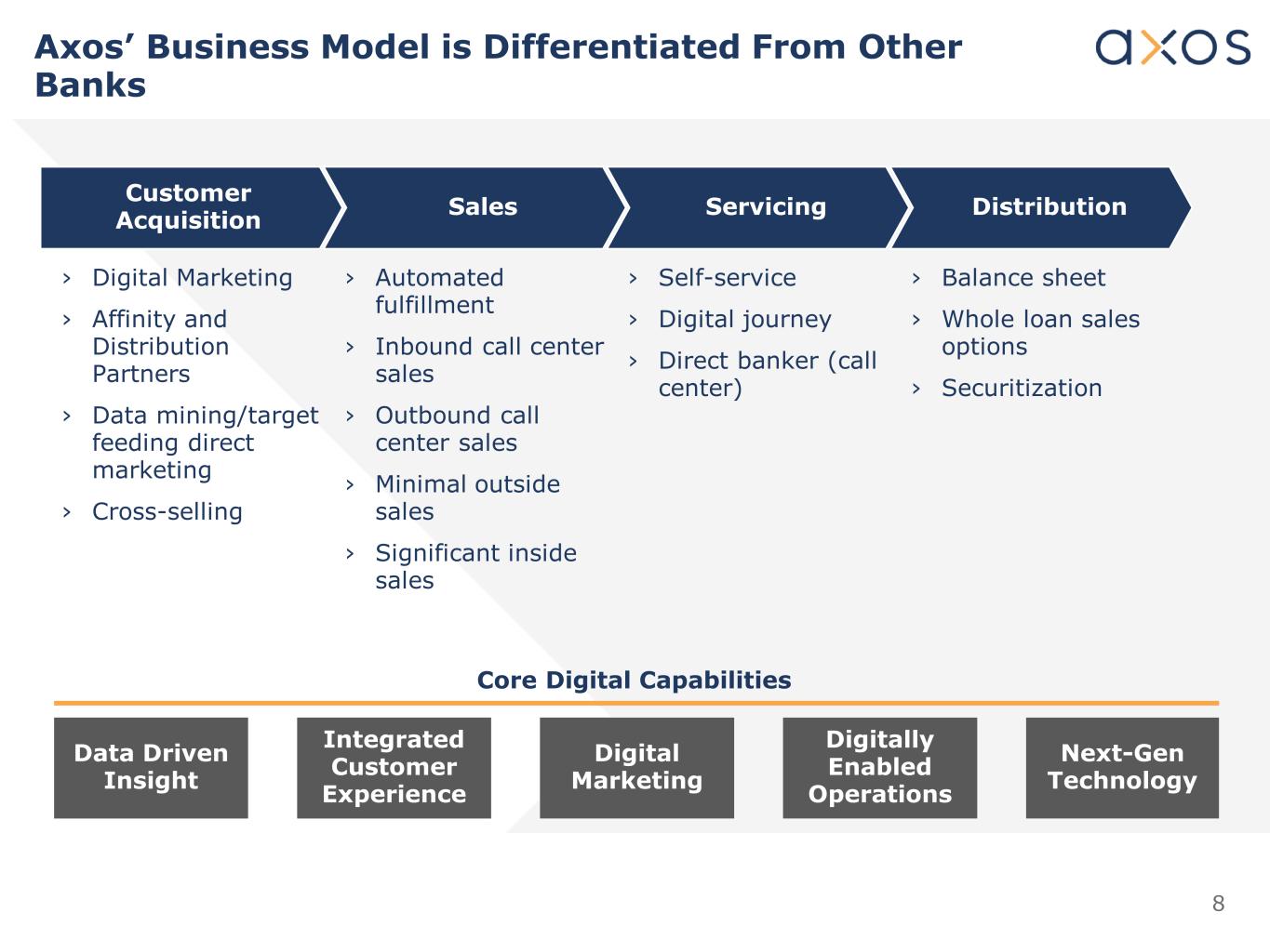 7 › Diverse mix of assets, deposits, and fee income reduces risk and provides multiple growth opportunities in varying environments › Asset-based lending at low loan-to-values has resulted in low historical credit losses › Differentiated retail digital strategy from “online savings banks” or fin-tech competitors › Structural cost advantage vs. traditional banks › New business initiatives generate incremental growth › Direct-to-consumer and securities clearing and custody businesses provide differentiated sources of growth › Technology synergies among divisions reduce overall client acquisition and servicing costs Investment Thesis Axos Financial’s Three Divisions Provide the Foundation for Sustained Long-term Growth Consumer Banking Commercial Banking Securities