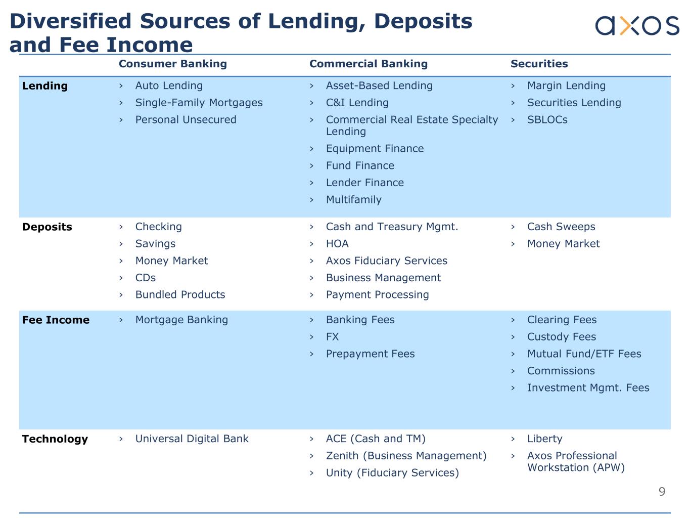 8 Customer Acquisition Sales Servicing Distribution › Digital Marketing › Affinity and Distribution Partners › Data mining/target feeding direct marketing › Cross-selling › Automated fulfillment › Inbound call center sales › Outbound call center sales › Minimal outside sales › Significant inside sales › Self-service › Digital journey › Direct banker (call center) › Balance sheet › Whole loan sales options › Securitization Data Driven Insight Integrated Customer Experience Digital Marketing Digitally Enabled Operations Next-Gen Technology Core Digital Capabilities Axos’ Business Model is Differentiated From Other Banks