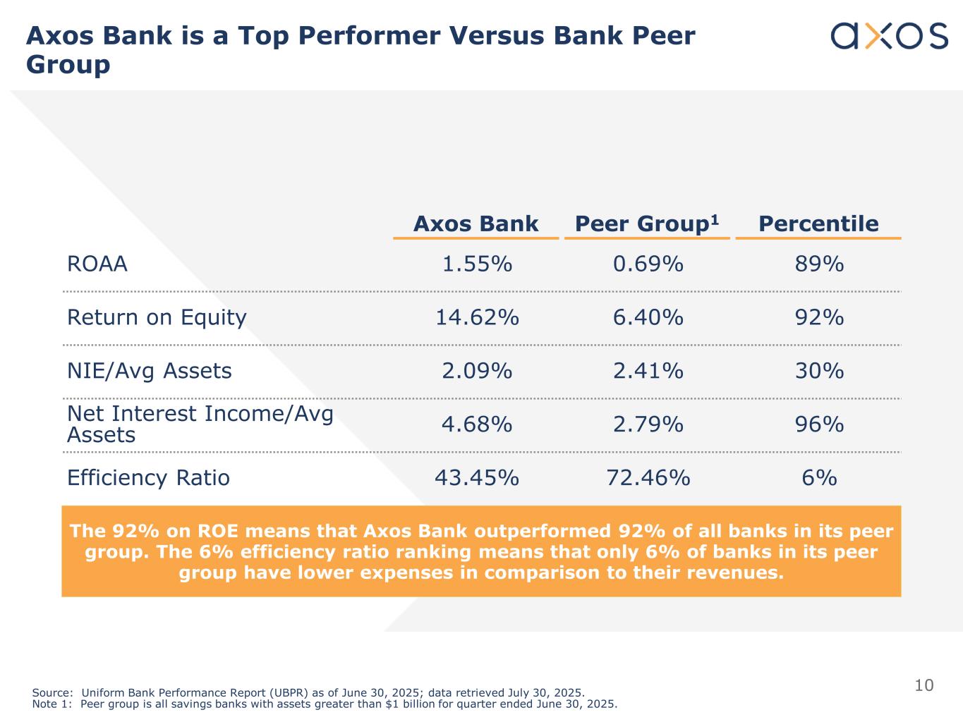 10 Axos Bank Peer Group1 Percentile ROAA 1.55% 0.69% 89% Return on Equity 14.62% 6.40% 92% NIE/Avg Assets 2.09% 2.41% 30% Net Interest Income/Avg Assets 4.68% 2.79% 96% Efficiency Ratio 43.45% 72.46% 6% Source: Uniform Bank Performance Report (UBPR) as of June 30, 2025; data retrieved July 30, 2025. Note 1: Peer group is all savings banks with assets greater than $1 billion for quarter ended June 30, 2025. Axos Bank is a Top Performer Versus Bank Peer Group The 92% on ROE means that Axos Bank outperformed 92% of all banks in its peer group. The 6% efficiency ratio ranking means that only 6% of banks in its peer group have lower expenses in comparison to their revenues.