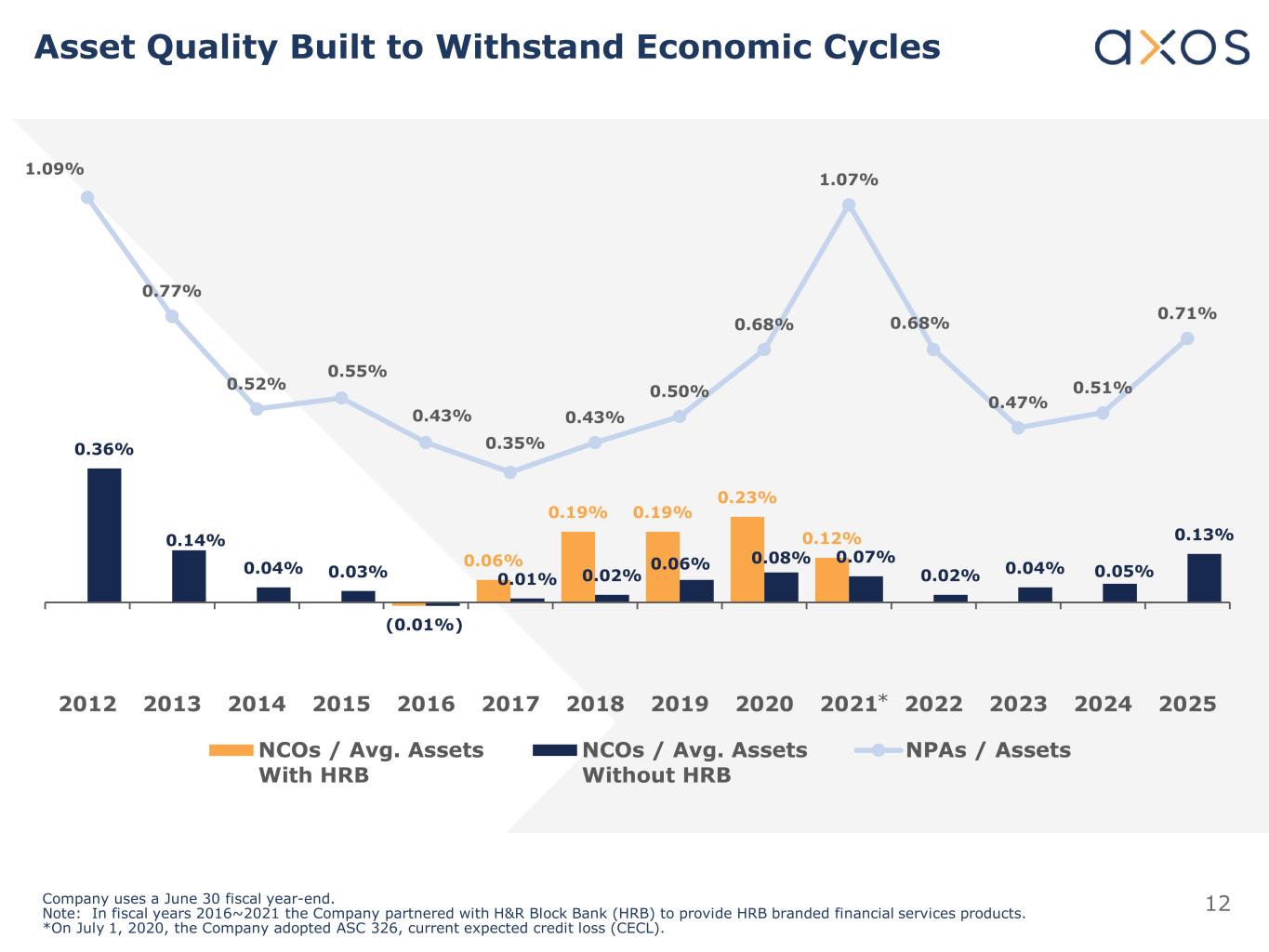 11 Over 15 Years of Profitable Growth Net Income has continued to grow throughout multiple economic cycles $4 $7 $21 $21 $29 $40 $56 $83 $119 $135 $152 $155 $183 $216 $241 $307 $450 $433 - 50 100 150 200 250 300 350 400 450 500 2008 2009 2010 2011 2012 2013 2014 2015 2016 2017 2018 2019 2020 2021 2022 2023 2024 2025 ($M) Net Income Note: Company uses a June 30 fiscal year-end. Note: Fiscal year 2024 includes a one-time $92.4 million pre-tax ($65.4 million after-tax) gain related to the purchase of loans from the Federal Deposit Insurance Corporation (FDIC).