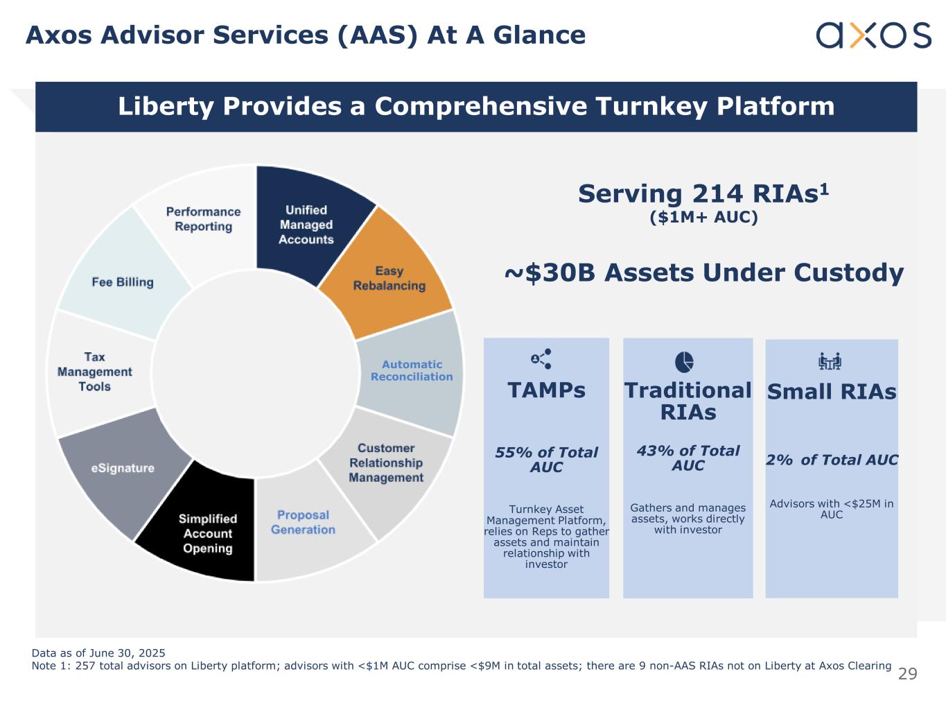 28 › Leadership team with more than 100 years combined industry experience. › Proprietary front- and back-end technologies for advisors and broker- dealers. › Axos Advisor Services is the 7th largest RIA custodian in the U.S. › More than $35 billion in Clearing Services client assets under custody and/or administration. Three Months Ended June 30, 2025 Three Months Ended June 30, 2019 Axos Clearing and Custody Highlights Custody $ — Clearing Fees & Execution 5,442,487 Cash Sorting 2,198,140 Margin Lending 3,040,793 Securities Lending 880,751 Net Interest Income (30,406) Net Revenues $ 11,531,765 Custody $ 7,749,487 Clearing Fees & Execution 6,666,263 Cash Sorting 14,954,010 Margin Lending 3,999,096 Securities Lending 2,101,870 Net Interest Income 1,183,427 Net Revenues $ 36,654,153