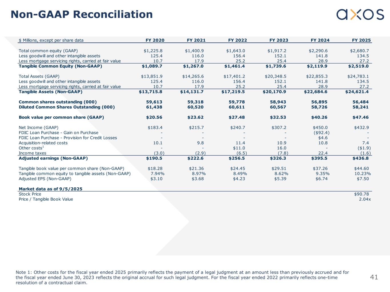 40 Select Financials FY 2020 FY 2021 FY 2022 FY 2023 FY 2024 FY 2025 Selected Balance Sheet Data ($ Millions) Total Assets $13,851.9 $14,265.6 $17,401.2 $20,348.5 $22,855.3 $24,783.1 Net Loans 10,631.3 11,414.8 14,091.1 16,456.7 19,231.4 21,049.6 Loans Held for Sale, at Fair Value 52.0 29.8 5.0 23.2 16.5 10.0 Allowance for Credit Losses 75.8 133.0 148.6 166.7 260.5 290.0 Securities 187.7 189.3 264.3 233.1 142.0 66.7 Total Deposits 11,336.7 10,815.8 13,946.4 17,123.1 19,359.2 20,829.5 Advances from the FHLB 242.5 353.5 117.5 90.0 90.0 60.0 Borrowings 235.8 221.4 445.2 361.8 325.7 312.7 Total Stockholders' Equity 1,230.8 1,400.9 1,643.0 1,917.2 2,290.6 2,680.7 Selected Income Statement Data Net Interest Income $477.6 $538.7 $607.2 $783.1 $961.4 $1,127.8 Provision for Loan and Lease Losses 42.3 23.5 23.8 24.3 32.5 55.7 Non-Interest Income 103.0 105.3 113.4 120.5 222.7 131.1 Non-Interest Expense 275.7 314.8 356.8 447.6 516.1 589.7 Net Income 183.4 215.7 240.7 307.2 450.0 432.9 Per Common Share Data Diluted EPS $2.98 $3.56 $3.97 $5.07 $7.66 $7.43 Adjusted Earnings per Common Share (Non-GAAP)1 3.10 3.68 4.23 5.39 6.74 7.50 Book Value Per Common Share 20.56 23.62 27.48 32.53 40.26 47.46 Tangible Book Value per Common Share (Non-GAAP)1 18.28 21.36 24.45 29.51 37.26 44.60 Performance Ratios and Other Data ROAA 1.53 % 1.52 % 1.57 % 1.64 % 2.08 % 1.82 ROAE 15.65 16.51 15.61 17.22 21.64 17.30 Interest Rate Spread 3.65 3.70 3.91 3.44 3.62 3.97 Net Interest Margin 4.12 3.92 4.13 4.35 4.62 4.90 Net Interest Margin - Banking Segment Only 4.19 4.11 4.36 4.48 4.68 4.95 Efficiency Ratio 47.48 48.88 49.52 49.54 43.59 46.84 Efficiency Ratio - Banking Segment Only 39.79 42.00 40.81 47.82 38.42 40.80 Asset Quality Metrics NCOs / Average Loans 0.23 % 0.12 % 0.02 % 0.04 % 0.05 % 0.13 NPLs / Loans 0.82 1.26 0.83 0.52 0.57 0.79 NPAs / Assets 0.68 1.07 0.68 0.47 0.51 0.71 ALLL / Loans HFI 0.71 1.15 1.04 1.00 1.34 1.36 ALLL / NPLs 86.20 91.57 125.74 191.23 229.84 170.23 Capital Ratios TCE / TA1 7.94 % 8.97 % 8.49 % 8.62 % 9.35 % 10.23 CET1 Ratio 11.22 11.36 9.86 10.94 12.01 12.52 Leverage Ratio 8.97 8.82 9.25 8.96 9.43 10.73 Tier 1 Capital 11.27 11.36 9.86 10.94 12.01 12.52 Total Capital 12.64 13.78 12.73 13.82 14.84 15.28 Note 1: Adjusted (non-GAAP) metrics. See Non-GAAP Reconciliation for the closest applicable GAAP metrics.