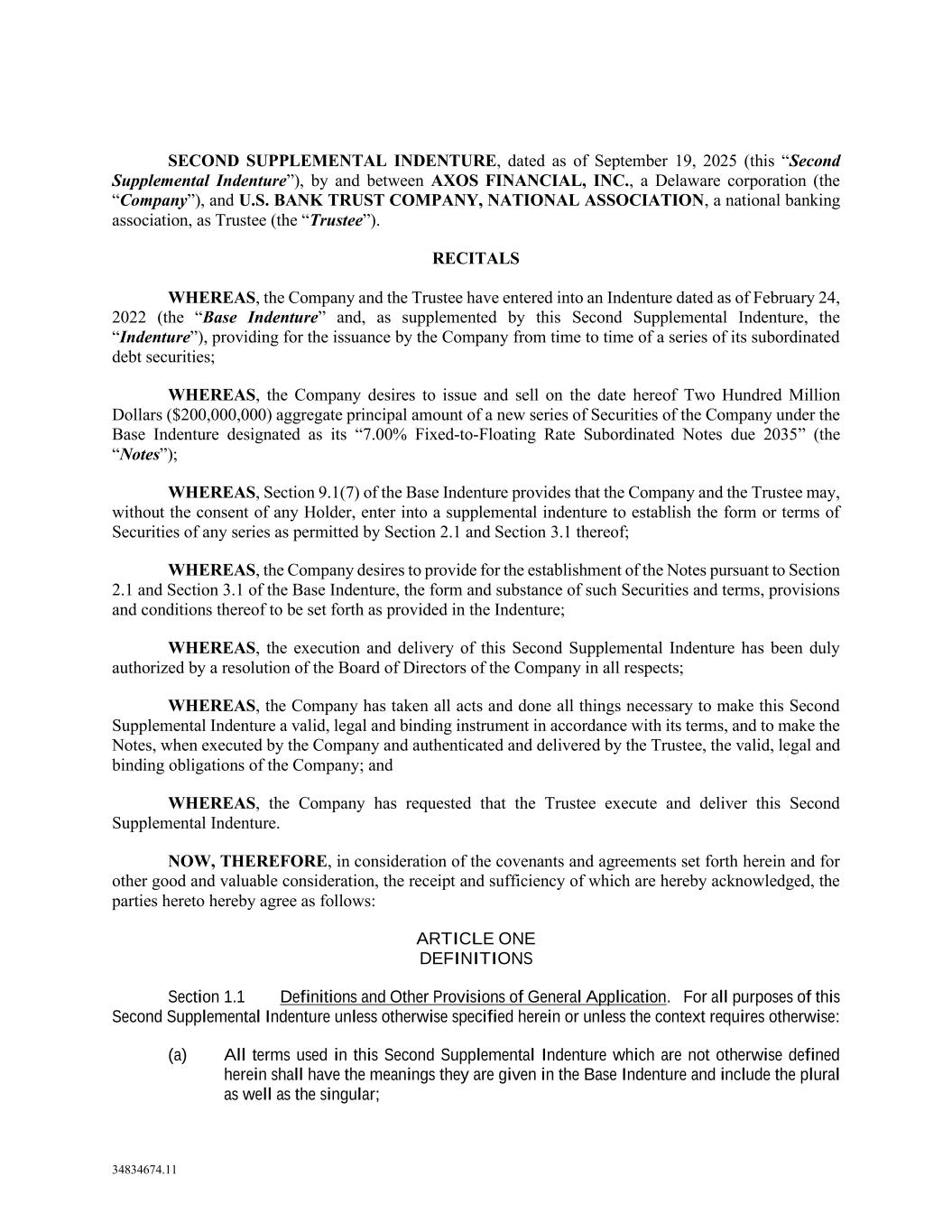 34834674.11 SECOND SUPPLEMENTAL INDENTURE, dated as of September 19, 2025 (this “Second Supplemental Indenture”), by and between AXOS FINANCIAL, INC., a Delaware corporation (the “Company”), and U.S. BANK TRUST COMPANY, NATIONAL ASSOCIATION, a national banking association, as Trustee (the “Trustee”). RECITALS WHEREAS, the Company and the Trustee have entered into an Indenture dated as of February 24, 2022 (the “Base Indenture” and, as supplemented by this Second Supplemental Indenture, the “Indenture”), providing for the issuance by the Company from time to time of a series of its subordinated debt securities; WHEREAS, the Company desires to issue and sell on the date hereof Two Hundred Million Dollars ($200,000,000) aggregate principal amount of a new series of Securities of the Company under the Base Indenture designated as its “7.00% Fixed-to-Floating Rate Subordinated Notes due 2035” (the “Notes”); WHEREAS, Section 9.1(7) of the Base Indenture provides that the Company and the Trustee may, without the consent of any Holder, enter into a supplemental indenture to establish the form or terms of Securities of any series as permitted by Section 2.1 and Section 3.1 thereof; WHEREAS, the Company desires to provide for the establishment of the Notes pursuant to Section 2.1 and Section 3.1 of the Base Indenture, the form and substance of such Securities and terms, provisions and conditions thereof to be set forth as provided in the Indenture; WHEREAS, the execution and delivery of this Second Supplemental Indenture has been duly authorized by a resolution of the Board of Directors of the Company in all respects; WHEREAS, the Company has taken all acts and done all things necessary to make this Second Supplemental Indenture a valid, legal and binding instrument in accordance with its terms, and to make the Notes, when executed by the Company and authenticated and delivered by the Trustee, the valid, legal and binding obligations of the Company; and WHEREAS, the Company has requested that the Trustee execute and deliver this Second Supplemental Indenture. NOW, THEREFORE, in consideration of the covenants and agreements set forth herein and for other good and valuable consideration, the receipt and sufficiency of which are hereby acknowledged, the parties hereto hereby agree as follows: ARTICLE ONE DEFINITIONS Section 1.1 Definitions and Other Provisions of General Application. For all purposes of this Second Supplemental Indenture unless otherwise specified herein or unless the context requires otherwise: (a) All terms used in this Second Supplemental Indenture which are not otherwise defined herein shall have the meanings they are given in the Base Indenture and include the plural as well as the singular;