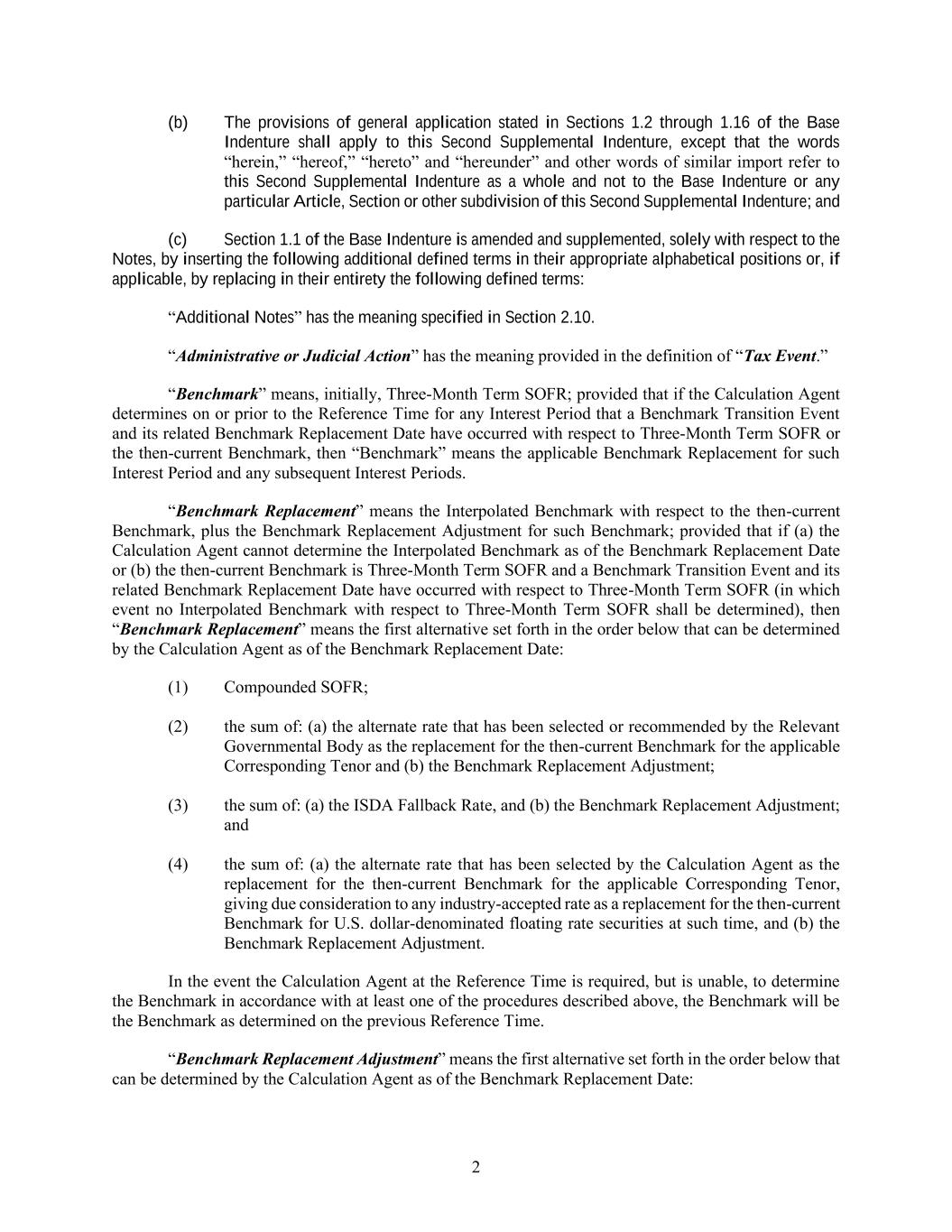 2 (b) The provisions of general application stated in Sections 1.2 through 1.16 of the Base Indenture shall apply to this Second Supplemental Indenture, except that the words “herein,” “hereof,” “hereto” and “hereunder” and other words of similar import refer to this Second Supplemental Indenture as a whole and not to the Base Indenture or any particular Article, Section or other subdivision of this Second Supplemental Indenture; and (c) Section 1.1 of the Base Indenture is amended and supplemented, solely with respect to the Notes, by inserting the following additional defined terms in their appropriate alphabetical positions or, if applicable, by replacing in their entirety the following defined terms: “Additional Notes” has the meaning specified in Section 2.10. “Administrative or Judicial Action” has the meaning provided in the definition of “Tax Event.” “Benchmark” means, initially, Three-Month Term SOFR; provided that if the Calculation Agent determines on or prior to the Reference Time for any Interest Period that a Benchmark Transition Event and its related Benchmark Replacement Date have occurred with respect to Three-Month Term SOFR or the then-current Benchmark, then “Benchmark” means the applicable Benchmark Replacement for such Interest Period and any subsequent Interest Periods. “Benchmark Replacement” means the Interpolated Benchmark with respect to the then-current Benchmark, plus the Benchmark Replacement Adjustment for such Benchmark; provided that if (a) the Calculation Agent cannot determine the Interpolated Benchmark as of the Benchmark Replacement Date or (b) the then-current Benchmark is Three-Month Term SOFR and a Benchmark Transition Event and its related Benchmark Replacement Date have occurred with respect to Three-Month Term SOFR (in which event no Interpolated Benchmark with respect to Three-Month Term SOFR shall be determined), then “Benchmark Replacement” means the first alternative set forth in the order below that can be determined by the Calculation Agent as of the Benchmark Replacement Date: (1) Compounded SOFR; (2) the sum of: (a) the alternate rate that has been selected or recommended by the Relevant Governmental Body as the replacement for the then-current Benchmark for the applicable Corresponding Tenor and (b) the Benchmark Replacement Adjustment; (3) the sum of: (a) the ISDA Fallback Rate, and (b) the Benchmark Replacement Adjustment; and (4) the sum of: (a) the alternate rate that has been selected by the Calculation Agent as the replacement for the then-current Benchmark for the applicable Corresponding Tenor, giving due consideration to any industry-accepted rate as a replacement for the then-current Benchmark for U.S. dollar-denominated floating rate securities at such time, and (b) the Benchmark Replacement Adjustment. In the event the Calculation Agent at the Reference Time is required, but is unable, to determine the Benchmark in accordance with at least one of the procedures described above, the Benchmark will be the Benchmark as determined on the previous Reference Time. “Benchmark Replacement Adjustment” means the first alternative set forth in the order below that can be determined by the Calculation Agent as of the Benchmark Replacement Date: