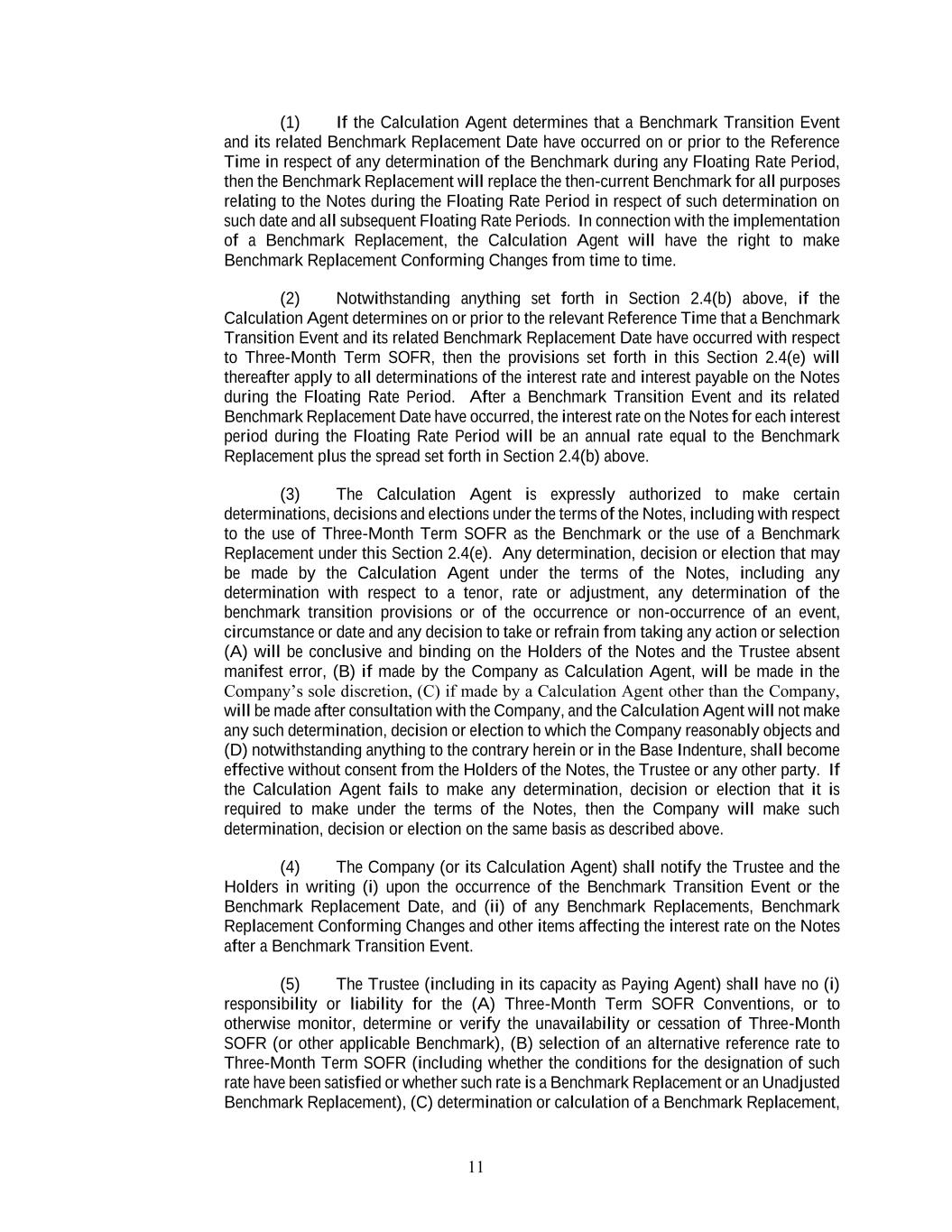 11 (1) If the Calculation Agent determines that a Benchmark Transition Event and its related Benchmark Replacement Date have occurred on or prior to the Reference Time in respect of any determination of the Benchmark during any Floating Rate Period, then the Benchmark Replacement will replace the then-current Benchmark for all purposes relating to the Notes during the Floating Rate Period in respect of such determination on such date and all subsequent Floating Rate Periods. In connection with the implementation of a Benchmark Replacement, the Calculation Agent will have the right to make Benchmark Replacement Conforming Changes from time to time. (2) Notwithstanding anything set forth in Section 2.4(b) above, if the Calculation Agent determines on or prior to the relevant Reference Time that a Benchmark Transition Event and its related Benchmark Replacement Date have occurred with respect to Three-Month Term SOFR, then the provisions set forth in this Section 2.4(e) will thereafter apply to all determinations of the interest rate and interest payable on the Notes during the Floating Rate Period. After a Benchmark Transition Event and its related Benchmark Replacement Date have occurred, the interest rate on the Notes for each interest period during the Floating Rate Period will be an annual rate equal to the Benchmark Replacement plus the spread set forth in Section 2.4(b) above. (3) The Calculation Agent is expressly authorized to make certain determinations, decisions and elections under the terms of the Notes, including with respect to the use of Three-Month Term SOFR as the Benchmark or the use of a Benchmark Replacement under this Section 2.4(e). Any determination, decision or election that may be made by the Calculation Agent under the terms of the Notes, including any determination with respect to a tenor, rate or adjustment, any determination of the benchmark transition provisions or of the occurrence or non-occurrence of an event, circumstance or date and any decision to take or refrain from taking any action or selection (A) will be conclusive and binding on the Holders of the Notes and the Trustee absent manifest error, (B) if made by the Company as Calculation Agent, will be made in the Company’s sole discretion, (C) if made by a Calculation Agent other than the Company, will be made after consultation with the Company, and the Calculation Agent will not make any such determination, decision or election to which the Company reasonably objects and (D) notwithstanding anything to the contrary herein or in the Base Indenture, shall become effective without consent from the Holders of the Notes, the Trustee or any other party. If the Calculation Agent fails to make any determination, decision or election that it is required to make under the terms of the Notes, then the Company will make such determination, decision or election on the same basis as described above. (4) The Company (or its Calculation Agent) shall notify the Trustee and the Holders in writing (i) upon the occurrence of the Benchmark Transition Event or the Benchmark Replacement Date, and (ii) of any Benchmark Replacements, Benchmark Replacement Conforming Changes and other items affecting the interest rate on the Notes after a Benchmark Transition Event. (5) The Trustee (including in its capacity as Paying Agent) shall have no (i) responsibility or liability for the (A) Three-Month Term SOFR Conventions, or to otherwise monitor, determine or verify the unavailability or cessation of Three-Month SOFR (or other applicable Benchmark), (B) selection of an alternative reference rate to Three-Month Term SOFR (including whether the conditions for the designation of such rate have been satisfied or whether such rate is a Benchmark Replacement or an Unadjusted Benchmark Replacement), (C) determination or calculation of a Benchmark Replacement,