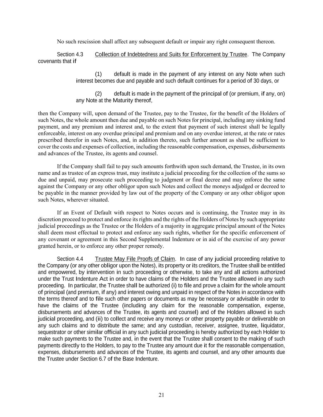 21 No such rescission shall affect any subsequent default or impair any right consequent thereon. Section 4.3 Collection of Indebtedness and Suits for Enforcement by Trustee. The Company covenants that if (1) default is made in the payment of any interest on any Note when such interest becomes due and payable and such default continues for a period of 30 days, or (2) default is made in the payment of the principal of (or premium, if any, on) any Note at the Maturity thereof, then the Company will, upon demand of the Trustee, pay to the Trustee, for the benefit of the Holders of such Notes, the whole amount then due and payable on such Notes for principal, including any sinking fund payment, and any premium and interest and, to the extent that payment of such interest shall be legally enforceable, interest on any overdue principal and premium and on any overdue interest, at the rate or rates prescribed therefor in such Notes, and, in addition thereto, such further amount as shall be sufficient to cover the costs and expenses of collection, including the reasonable compensation, expenses, disbursements and advances of the Trustee, its agents and counsel. If the Company shall fail to pay such amounts forthwith upon such demand, the Trustee, in its own name and as trustee of an express trust, may institute a judicial proceeding for the collection of the sums so due and unpaid, may prosecute such proceeding to judgment or final decree and may enforce the same against the Company or any other obligor upon such Notes and collect the moneys adjudged or decreed to be payable in the manner provided by law out of the property of the Company or any other obligor upon such Notes, wherever situated. If an Event of Default with respect to Notes occurs and is continuing, the Trustee may in its discretion proceed to protect and enforce its rights and the rights of the Holders of Notes by such appropriate judicial proceedings as the Trustee or the Holders of a majority in aggregate principal amount of the Notes shall deem most effectual to protect and enforce any such rights, whether for the specific enforcement of any covenant or agreement in this Second Supplemental Indenture or in aid of the exercise of any power granted herein, or to enforce any other proper remedy. Section 4.4 Trustee May File Proofs of Claim. In case of any judicial proceeding relative to the Company (or any other obligor upon the Notes), its property or its creditors, the Trustee shall be entitled and empowered, by intervention in such proceeding or otherwise, to take any and all actions authorized under the Trust Indenture Act in order to have claims of the Holders and the Trustee allowed in any such proceeding. In particular, the Trustee shall be authorized (i) to file and prove a claim for the whole amount of principal (and premium, if any) and interest owing and unpaid in respect of the Notes in accordance with the terms thereof and to file such other papers or documents as may be necessary or advisable in order to have the claims of the Trustee (including any claim for the reasonable compensation, expense, disbursements and advances of the Trustee, its agents and counsel) and of the Holders allowed in such judicial proceeding, and (ii) to collect and receive any moneys or other property payable or deliverable on any such claims and to distribute the same; and any custodian, receiver, assignee, trustee, liquidator, sequestrator or other similar official in any such judicial proceeding is hereby authorized by each Holder to make such payments to the Trustee and, in the event that the Trustee shall consent to the making of such payments directly to the Holders, to pay to the Trustee any amount due it for the reasonable compensation, expenses, disbursements and advances of the Trustee, its agents and counsel, and any other amounts due the Trustee under Section 6.7 of the Base Indenture.