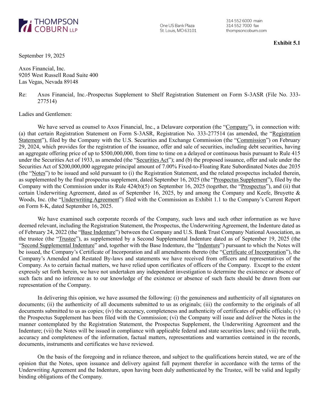 Exhibit 5.1 September 19, 2025 Axos Financial, Inc. 9205 West Russell Road Suite 400 Las Vegas, Nevada 89148 Re: Axos Financial, Inc.-Prospectus Supplement to Shelf Registration Statement on Form S-3ASR (File No. 333- 277514) Ladies and Gentlemen: We have served as counsel to Axos Financial, Inc., a Delaware corporation (the “Company”), in connection with: (a) that certain Registration Statement on Form S-3ASR, Registration No. 333-277514 (as amended, the “Registration Statement”), filed by the Company with the U.S. Securities and Exchange Commission (the “Commission”) on February 29, 2024, which provides for the registration of the issuance, offer and sale of securities, including debt securities, having an aggregate offering price of up to $500,000,000, from time to time on a delayed or continuous basis pursuant to Rule 415 under the Securities Act of 1933, as amended (the “Securities Act”); and (b) the proposed issuance, offer and sale under the Securities Act of $200,000,000 aggregate principal amount of 7.00% Fixed-to-Floating Rate Subordinated Notes due 2035 (the “Notes”) to be issued and sold pursuant to (i) the Registration Statement, and the related prospectus included therein, as supplemented by the final prospectus supplement, dated September 16, 2025 (the “Prospectus Supplement”), filed by the Company with the Commission under its Rule 424(b)(5) on September 16, 2025 (together, the “Prospectus”), and (ii) that certain Underwriting Agreement, dated as of September 16, 2025, by and among the Company and Keefe, Bruyette & Woods, Inc. (the “Underwriting Agreement”) filed with the Commission as Exhibit 1.1 to the Company’s Current Report on Form 8-K, dated September 16, 2025. We have examined such corporate records of the Company, such laws and such other information as we have deemed relevant, including the Registration Statement, the Prospectus, the Underwriting Agreement, the Indenture dated as of February 24, 2022 (the “Base Indenture”) between the Company and U.S. Bank Trust Company National Association, as the trustee (the “Trustee”), as supplemented by a Second Supplemental Indenture dated as of September 19, 2025 (the “Second Supplemental Indenture” and, together with the Base Indenture, the “Indenture”) pursuant to which the Notes will be issued, the Company’s Certificate of Incorporation and all amendments thereto (the “Certificate of Incorporation”), the Company’s Amended and Restated By-laws and statements we have received from officers and representatives of the Company. As to certain factual matters, we have relied upon certificates of officers of the Company. Except to the extent expressly set forth herein, we have not undertaken any independent investigation to determine the existence or absence of such facts and no inference as to our knowledge of the existence or absence of such facts should be drawn from our representation of the Company. In delivering this opinion, we have assumed the following: (i) the genuineness and authenticity of all signatures on documents; (ii) the authenticity of all documents submitted to us as originals; (iii) the conformity to the originals of all documents submitted to us as copies; (iv) the accuracy, completeness and authenticity of certificates of public officials; (v) the Prospectus Supplement has been filed with the Commission; (vi) the Company will issue and deliver the Notes in the manner contemplated by the Registration Statement, the Prospectus Supplement, the Underwriting Agreement and the Indenture; (vii) the Notes will be issued in compliance with applicable federal and state securities laws; and (viii) the truth, accuracy and completeness of the information, factual matters, representations and warranties contained in the records, documents, instruments and certificates we have reviewed. On the basis of the foregoing and in reliance thereon, and subject to the qualifications herein stated, we are of the opinion that the Notes, upon issuance and delivery against full payment therefor in accordance with the terms of the Underwriting Agreement and the Indenture, upon having been duly authenticated by the Trustee, will be valid and legally binding obligations of the Company.