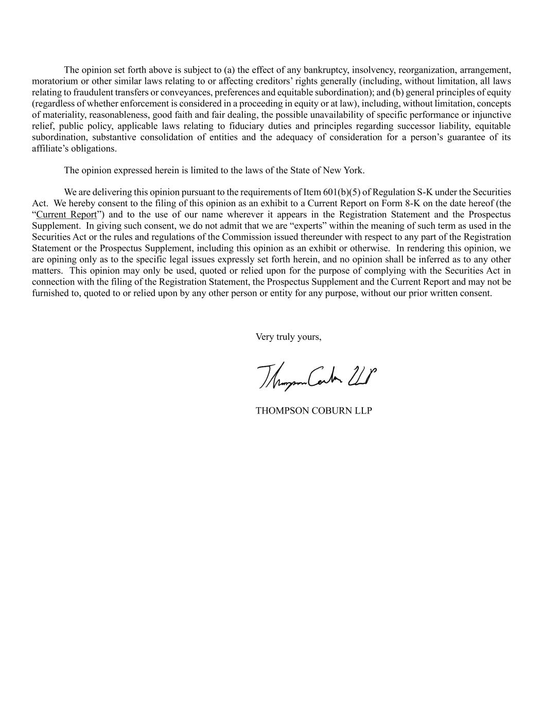 The opinion set forth above is subject to (a) the effect of any bankruptcy, insolvency, reorganization, arrangement, moratorium or other similar laws relating to or affecting creditors’ rights generally (including, without limitation, all laws relating to fraudulent transfers or conveyances, preferences and equitable subordination); and (b) general principles of equity (regardless of whether enforcement is considered in a proceeding in equity or at law), including, without limitation, concepts of materiality, reasonableness, good faith and fair dealing, the possible unavailability of specific performance or injunctive relief, public policy, applicable laws relating to fiduciary duties and principles regarding successor liability, equitable subordination, substantive consolidation of entities and the adequacy of consideration for a person’s guarantee of its affiliate’s obligations. The opinion expressed herein is limited to the laws of the State of New York. We are delivering this opinion pursuant to the requirements of Item 601(b)(5) of Regulation S-K under the Securities Act. We hereby consent to the filing of this opinion as an exhibit to a Current Report on Form 8-K on the date hereof (the “Current Report”) and to the use of our name wherever it appears in the Registration Statement and the Prospectus Supplement. In giving such consent, we do not admit that we are “experts” within the meaning of such term as used in the Securities Act or the rules and regulations of the Commission issued thereunder with respect to any part of the Registration Statement or the Prospectus Supplement, including this opinion as an exhibit or otherwise. In rendering this opinion, we are opining only as to the specific legal issues expressly set forth herein, and no opinion shall be inferred as to any other matters. This opinion may only be used, quoted or relied upon for the purpose of complying with the Securities Act in connection with the filing of the Registration Statement, the Prospectus Supplement and the Current Report and may not be furnished to, quoted to or relied upon by any other person or entity for any purpose, without our prior written consent. Very truly yours, THOMPSON COBURN LLP