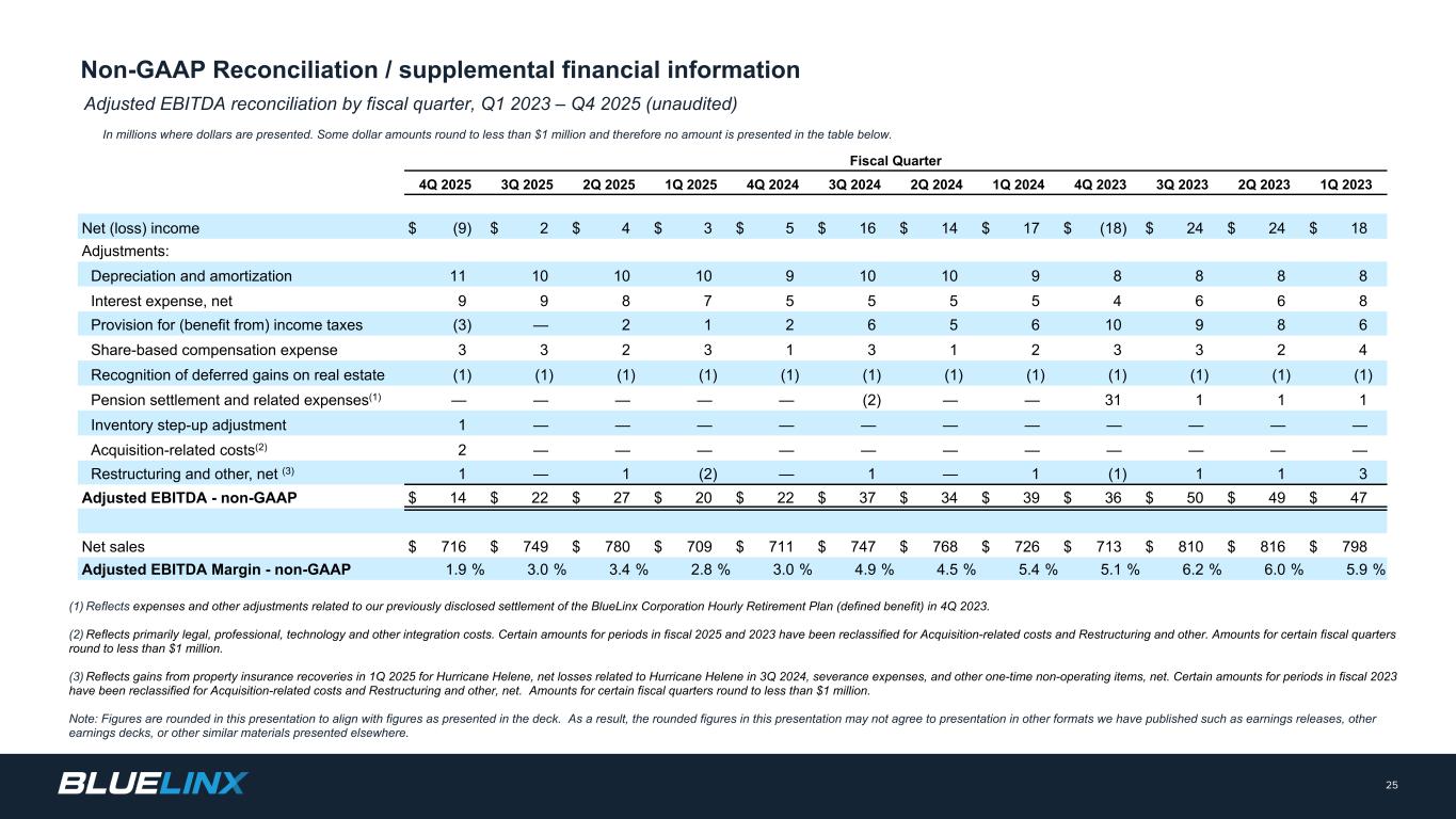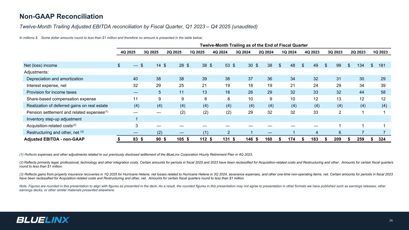 Adjusted EBITDA reconciliation by fiscal quarter, Q1 2023 – Q4 2025 (unaudited) In millions where dollars are presented. Some dollar amounts round to less than $1 million and therefore no amount is presented in the table below. 25 (1) Reflects expenses and other adjustments related to our previously disclosed settlement of the BlueLinx Corporation Hourly Retirement Plan (defined benefit) in 4Q 2023. (2) Reflects primarily legal, professional, technology and other integration costs. Certain amounts for periods in fiscal 2025 and 2023 have been reclassified for Acquisition-related costs and Restructuring and other. Amounts for certain fiscal quarters round to less than $1 million. (3) Reflects gains from property insurance recoveries in 1Q 2025 for Hurricane Helene, net losses related to Hurricane Helene in 3Q 2024, severance expenses, and other one-time non-operating items, net. Certain amounts for periods in fiscal 2023 have been reclassified for Acquisition-related costs and Restructuring and other, net. Amounts for certain fiscal quarters round to less than $1 million. Note: Figures are rounded in this presentation to align with figures as presented in the deck. As a result, the rounded figures in this presentation may not agree to presentation in other formats we have published such as earnings releases, other earnings decks, or other similar materials presented elsewhere. Fiscal Quarter 4Q 2025 3Q 2025 2Q 2025 1Q 2025 4Q 2024 3Q 2024 2Q 2024 1Q 2024 4Q 2023 3Q 2023 2Q 2023 1Q 2023 Net (loss) income $ (9) $ 2 $ 4 $ 3 $ 5 $ 16 $ 14 $ 17 $ (18) $ 24 $ 24 $ 18 Adjustments: Depreciation and amortization 11 10 10 10 9 10 10 9 8 8 8 8 Interest expense, net 9 9 8 7 5 5 5 5 4 6 6 8 Provision for (benefit from) income taxes (3) — 2 1 2 6 5 6 10 9 8 6 Share-based compensation expense 3 3 2 3 1 3 1 2 3 3 2 4 Recognition of deferred gains on real estate (1) (1) (1) (1) (1) (1) (1) (1) (1) (1) (1) (1) Pension settlement and related expenses(1) — — — — — (2) — — 31 1 1 1 Inventory step-up adjustment 1 — — — — — — — — — — — Acquisition-related costs(2) 2 — — — — — — — — — — — Restructuring and other, net (3) 1 — 1 (2) — 1 — 1 (1) 1 1 3 Adjusted EBITDA - non-GAAP $ 14 $ 22 $ 27 $ 20 $ 22 $ 37 $ 34 $ 39 $ 36 $ 50 $ 49 $ 47 Net sales $ 716 $ 749 $ 780 $ 709 $ 711 $ 747 $ 768 $ 726 $ 713 $ 810 $ 816 $ 798 Adjusted EBITDA Margin - non-GAAP 1.9 % 3.0 % 3.4 % 2.8 % 3.0 % 4.9 % 4.5 % 5.4 % 5.1 % 6.2 % 6.0 % 5.9 % Non-GAAP Reconciliation / supplemental financial information