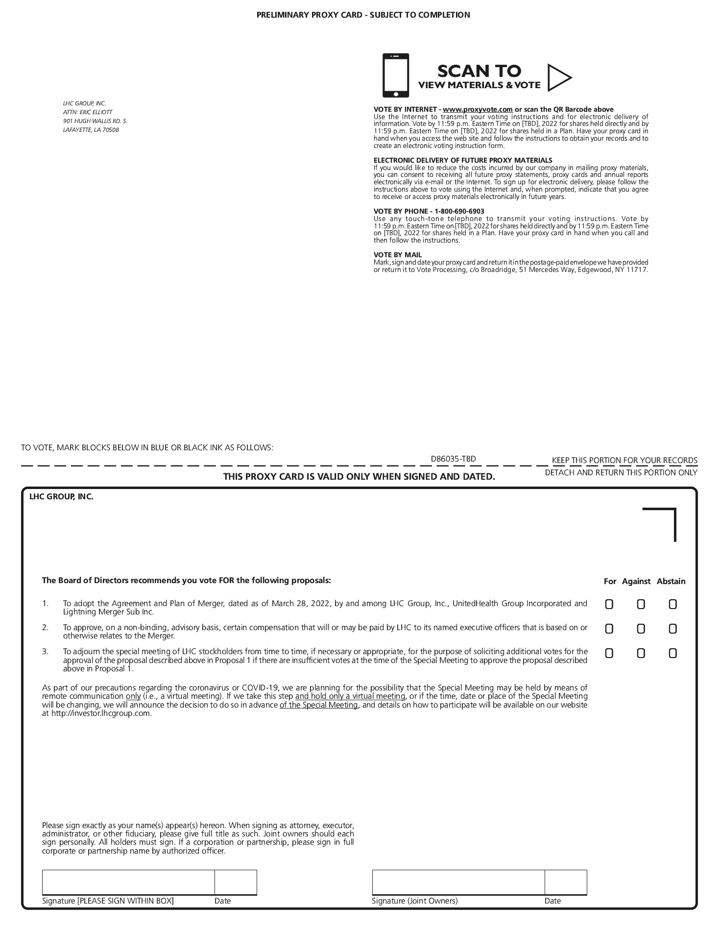 The Merger cannot be completed unless LHC stockholders adopt the Merger Agreement. Your vote is very important, regardless of the number of shares you own. Whether or not you expect to attend the Special Meeting virtually, please submit a proxy to vote your shares as promptly as possible so that your shares may be represented and voted at the Special Meeting. If you attend the Special Meeting and vote in person during the meeting, your vote by ballot will revoke any proxy previously submitted. If you are a stockholder of record and you do not sign and return your proxy or attend the Special Meeting, your shares will not be counted for purposes of determining whether a quorum is present at the Special Meeting and will have the same effect as a vote “AGAINST” the Merger Proposal, but will have no effect on the outcome of the Named Executive Officer Merger-Related Compensation Proposal or the Adjournment Proposal, assuming that a quorum exists.