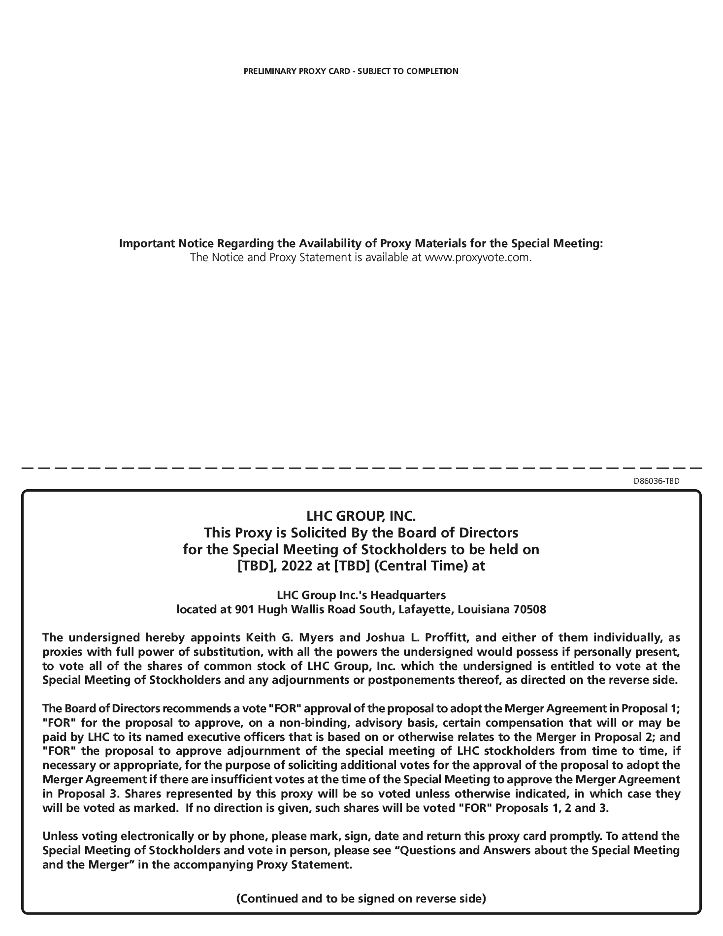 At the Special Meeting, stockholders will also be asked to vote on (i) a proposal to approve, on a non-binding, advisory basis, certain compensation that will or may be paid to LHC’s named executive officers by LHC based on or otherwise relating to the Merger (the “Named Executive Officer Merger-Related Compensation Proposal”), as required by the rules adopted by the U.S. Securities and Exchange Commission (“SEC”), and (ii) a proposal to adjourn the Special Meeting, from time to time, if necessary or appropriate, to solicit additional votes for the approval of the proposal to adopt the Merger Agreement if there are insufficient votes at the time of the Special Meeting to adopt the Merger Agreement (the “Adjournment Proposal”). The Board unanimously recommends that you vote “FOR” each of these proposals.
