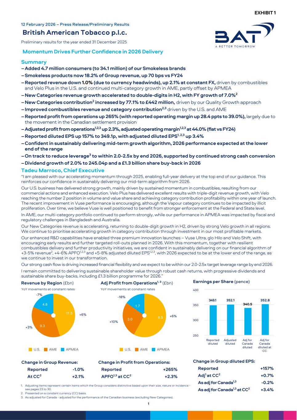 11.5 9.3 4.8 U.S. AME APMEA 6.53.0 1.7 U.S. AME APMEA Adj Profit from Operations1, 3 (£bn) YoY movements at constant rates -18 % +6 % +10% Reported diluted Adjusted diluted Adj for Canada diluted Adj for Canada diluted at CC 250 300 350 400 Earnings per Share (pence) 349.1 352.1 340.5 5 1 352.8 Change in Group diluted EPS: Reported +157 % Adj1 at CC2 +0.7 % As adj for Canada1,3 -0.2 % As adj for Canada1,3 at CC2 +3.4 % 12 February 2026 – Press Release/Preliminary Results British American Tobacco p.l.c. Preliminary results for the year ended 31 December 2025 Momentum Drives Further Confidence in 2026 Delivery Summary –Added 4.7 million consumers (to 34.1 million) of our Smokeless brands –Smokeless products now 18.2% of Group revenue, up 70 bps vs FY24 –Reported revenue down 1.0% (due to currency headwinds), up 2.1% at constant FX, driven by combustibles and Velo Plus in the U.S. and continued multi-category growth in AME, partly offset by APMEA –New Categories revenue growth accelerated to double-digits in H2, with FY growth of 7.0%2 –New Categories contribution2 increased by 77.1% to £442 million, driven by our Quality Growth approach –Improved combustibles revenue and category contribution2,3 driven by the U.S. and AME –Reported profit from operations up 265% (with reported operating margin up 28.4 ppts to 39.0%), largely due to the movement in the Canadian settlement provision –Adjusted profit from operations1,2,3 up 2.3%, adjusted operating margin1,2,3 at 44.0% (flat vs FY24) –Reported diluted EPS up 157% to 349.1p, with adjusted diluted EPS1, 2,3 up 3.4% –Confident in sustainably delivering mid-term growth algorithm, 2026 performance expected at the lower end of the range –On track to reduce leverage3 to within 2.0-2.5x by end 2026, supported by continued strong cash conversion –Dividend growth of 2.0% to 245.04p and a £1.3 billion share buy-back in 2026 Tadeu Marroco, Chief Executive “I am pleased with our accelerating momentum through 2025, enabling full-year delivery at the top end of our guidance. This reinforces our confidence in sustainably delivering our mid-term algorithm from 2026. Our U.S. business has delivered strong growth, mainly driven by sustained momentum in combustibles, resulting from our commercial actions and enhanced execution. Velo Plus has delivered excellent results with triple-digit revenue growth, with Velo reaching the number 2 position in volume and value share and achieving category contribution profitability within one year of launch. The recent improvement in Vuse performance is encouraging, although the Vapour category continues to be impacted by illicit proliferation. Over time, we believe Vuse is well positioned to benefit from stronger enforcement at the Federal and State level. In AME, our multi-category portfolio continued to perform strongly, while our performance in APMEA was impacted by fiscal and regulatory challenges in Bangladesh and Australia. Our New Categories revenue is accelerating, returning to double-digit growth in H2, driven by strong Velo growth in all regions. We continue to prioritise accelerating growth in category contribution through investment in our most profitable markets. Our enhanced R&D capabilities have enabled three premium innovation launches – Vuse Ultra, glo Hilo and Velo Shift, with encouraging early results and further targeted roll-outs planned in 2026. With this momentum, together with resilient combustibles delivery and further productivity initiatives, we are confident in sustainably delivering on our financial algorithm of +3-5% revenue2, +4-6% APFO1,2,3 and +5-8% adjusted diluted EPS1,2,3, with 2026 expected to be at the lower end of the range, as we continue to invest in our transformation. Our strong cash flow is driving increased financial flexibility and we expect to be within our 2.0-2.5x target leverage range by end 2026. I remain committed to delivering sustainable shareholder value through robust cash returns, with progressive dividends and sustainable share buy-backs, including £1.3 billion programme for 2026.” EXHIBIT 1 1 Revenue by Region (£bn) YoY movements at constant rates -7% +6% +3% Change in Profit from Operations: Reported +265 % APFO1,3 at CC2 +2.3 % Change in Group Revenue: Reported -1.0 % At CC2 +2.1 % 1. Adjusting items represent certain items which the Group considers distinctive based upon their size, nature or incidence - see pages 23 to 30. 2. Presented on a constant currency (CC) basis. 3. As adjusted for Canada - adjusted for the performance of the Canadian business (excluding New Categories).