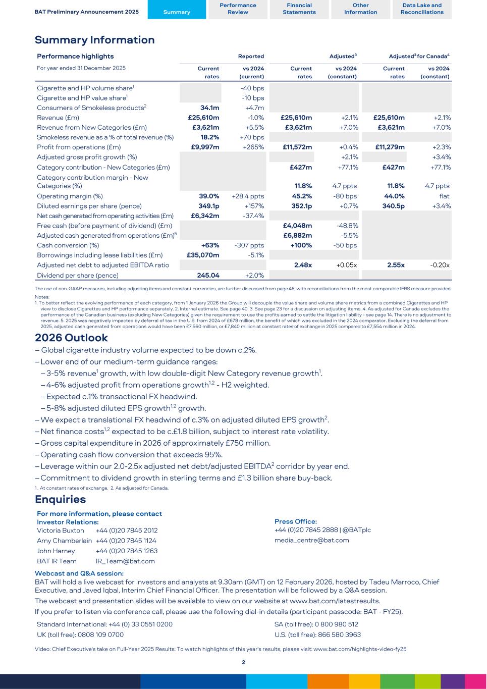 Summary Information Performance highlights Reported Adjusted3 Adjusted3 for Canada4 For year ended 31 December 2025 Current vs 2024 Current vs 2024 Current vs 2024 rates (current) rates (constant) rates (constant) Cigarette and HP volume share1 -40 bps Cigarette and HP value share1 -10 bps Consumers of Smokeless products2 34.1m +4.7m Revenue (£m) £25,610m -1.0% £25,610m +2.1 % £25,610m +2.1 % Revenue from New Categories (£m) £3,621m +5.5% £3,621m +7.0 % £3,621m +7.0 % Smokeless revenue as a % of total revenue (%) 18.2% +70 bps Profit from operations (£m) £9,997m +265% £11,572m +0.4 % £11,279m +2.3 % Adjusted gross profit growth (%) +2.1 % +3.4 % Category contribution - New Categories (£m) £427m +77.1 % £427m +77.1 % Category contribution margin - New Categories (%) 11.8% 4.7 ppts 11.8% 4.7 ppts Operating margin (%) 39.0% +28.4 ppts 45.2% -80 bps 44.0% flat Diluted earnings per share (pence) 349.1p +157% 352.1p +0.7 % 340.5p +3.4 % Net cash generated from operating activities (£m) £6,342m -37.4% Free cash (before payment of dividend) (£m) £4,048m -48.8 % Adjusted cash generated from operations (£m)5 £6,882m -5.5 % Cash conversion (%) +63% -307 ppts +100% -50 bps Borrowings including lease liabilities (£m) £35,070m -5.1% Adjusted net debt to adjusted EBITDA ratio 2.48x +0.05x 2.55x -0.20x Dividend per share (pence) 245.04 +2.0% The use of non-GAAP measures, including adjusting items and constant currencies, are further discussed from page 46, with reconciliations from the most comparable IFRS measure provided. Notes: 1. To better reflect the evolving performance of each category, from 1 January 2026 the Group will decouple the value share and volume share metrics from a combined Cigarettes and HP view to disclose Cigarettes and HP performance separately. 2. Internal estimate. See page 40. 3. See page 23 for a discussion on adjusting items. 4. As adjusted for Canada excludes the performance of the Canadian business (excluding New Categories) given the requirement to use the profits earned to settle the litigation liability - see page 14. There is no adjustment to revenue. 5. 2025 was negatively impacted by deferral of tax in the U.S. from 2024 of £678 million, the benefit of which was excluded in the 2024 comparator. Excluding the deferral from 2025, adjusted cash generated from operations would have been £7,560 million, or £7,840 million at constant rates of exchange in 2025 compared to £7,554 million in 2024. 2026 Outlook – Global cigarette industry volume expected to be down c.2%. – Lower end of our medium-term guidance ranges: – 3-5% revenue1 growth, with low double-digit New Category revenue growth1. – 4-6% adjusted profit from operations growth1,2 - H2 weighted. – Expected c.1% transactional FX headwind. – 5-8% adjusted diluted EPS growth1,2 growth. – We expect a translational FX headwind of c.3% on adjusted diluted EPS growth2. – Net finance costs1,2 expected to be c.£1.8 billion, subject to interest rate volatility. – Gross capital expenditure in 2026 of approximately £750 million. – Operating cash flow conversion that exceeds 95%. – Leverage within our 2.0-2.5x adjusted net debt/adjusted EBITDA2 corridor by year end. – Commitment to dividend growth in sterling terms and £1.3 billion share buy-back. 1. At constant rates of exchange. 2. As adjusted for Canada. Enquiries For more information, please contact Investor Relations: Victoria Buxton +44 (0)20 7845 2012 Amy Chamberlain +44 (0)20 7845 1124 John Harney +44 (0)20 7845 1263 BAT IR Team IR_Team@bat.com Press Office: +44 (0)20 7845 2888 | @BATplc media_centre@bat.com Webcast and Q&A session: BAT will hold a live webcast for investors and analysts at 9.30am (GMT) on 12 February 2026, hosted by Tadeu Marroco, Chief Executive, and Javed Iqbal, Interim Chief Financial Officer. The presentation will be followed by a Q&A session. The webcast and presentation slides will be available to view on our website at www.bat.com/latestresults. If you prefer to listen via conference call, please use the following dial-in details (participant passcode: BAT - FY25). Standard International: +44 (0) 33 0551 0200 SA (toll free): 0 800 980 512 UK (toll free): 0808 109 0700 U.S. (toll free): 866 580 3963 Video: Chief Executive's take on Full-Year 2025 Results: To watch highlights of this year's results, please visit: www.bat.com/highlights-video-fy25 BAT Preliminary Announcement 2025 Summary Performance Review Financial Statements Other Information Data Lake and Reconciliations 2