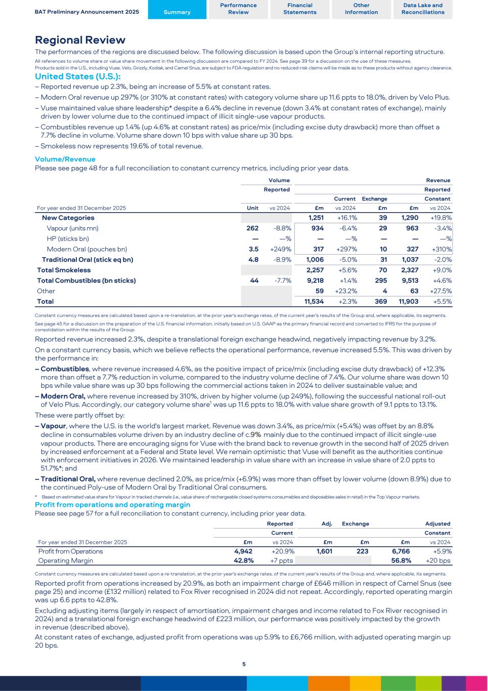Regional Review The performances of the regions are discussed below. The following discussion is based upon the Group’s internal reporting structure. All references to volume share or value share movement in the following discussion are compared to FY 2024. See page 39 for a discussion on the use of these measures. Products sold in the U.S., including Vuse, Velo, Grizzly, Kodiak, and Camel Snus, are subject to FDA regulation and no reduced-risk claims will be made as to these products without agency clearance. United States (U.S.): – Reported revenue up 2.3%, being an increase of 5.5% at constant rates. – Modern Oral revenue up 297% (or 310% at constant rates) with category volume share up 11.6 ppts to 18.0%, driven by Velo Plus. – Vuse maintained value share leadership* despite a 6.4% decline in revenue (down 3.4% at constant rates of exchange), mainly driven by lower volume due to the continued impact of illicit single-use vapour products. – Combustibles revenue up 1.4% (up 4.6% at constant rates) as price/mix (including excise duty drawback) more than offset a 7.7% decline in volume. Volume share down 10 bps with value share up 30 bps. – Smokeless now represents 19.6% of total revenue. Volume/Revenue Please see page 48 for a full reconciliation to constant currency metrics, including prior year data. For year ended 31 December 2025 Volume Revenue Reported Reported Current Exchange Constant Unit vs 2024 £m vs 2024 £m £m vs 2024 New Categories 1,251 +16.1 % 39 1,290 +19.8 % Vapour (units mn) 262 -8.8 % 934 -6.4 % 29 963 -3.4 % HP (sticks bn) — — % — — % — — — % Modern Oral (pouches bn) 3.5 +249 % 317 +297 % 10 327 +310 % Traditional Oral (stick eq bn) 4.8 -8.9 % 1,006 -5.0 % 31 1,037 -2.0 % Total Smokeless 2,257 +5.6 % 70 2,327 +9.0 % Total Combustibles (bn sticks) 44 -7.7 % 9,218 +1.4 % 295 9,513 +4.6 % Other 59 +23.2 % 4 63 +27.5 % Total 11,534 +2.3 % 369 11,903 +5.5 % Constant currency measures are calculated based upon a re-translation, at the prior year's exchange rates, of the current year's results of the Group and, where applicable, its segments. See page 45 for a discussion on the preparation of the U.S. financial information, initially based on U.S. GAAP as the primary financial record and converted to IFRS for the purpose of consolidation within the results of the Group. Reported revenue increased 2.3%, despite a translational foreign exchange headwind, negatively impacting revenue by 3.2%. On a constant currency basis, which we believe reflects the operational performance, revenue increased 5.5%. This was driven by the performance in: – Combustibles, where revenue increased 4.6%, as the positive impact of price/mix (including excise duty drawback) of +12.3% more than offset a 7.7% reduction in volume, compared to the industry volume decline of 7.4%. Our volume share was down 10 bps while value share was up 30 bps following the commercial actions taken in 2024 to deliver sustainable value; and – Modern Oral, where revenue increased by 310%, driven by higher volume (up 249%), following the successful national roll-out of Velo Plus. Accordingly, our category volume share1 was up 11.6 ppts to 18.0% with value share growth of 9.1 ppts to 13.1%. These were partly offset by: – Vapour, where the U.S. is the world's largest market. Revenue was down 3.4%, as price/mix (+5.4%) was offset by an 8.8% decline in consumables volume driven by an industry decline of c.9% mainly due to the continued impact of illicit single-use vapour products. There are encouraging signs for Vuse with the brand back to revenue growth in the second half of 2025 driven by increased enforcement at a Federal and State level. We remain optimistic that Vuse will benefit as the authorities continue with enforcement initiatives in 2026. We maintained leadership in value share with an increase in value share of 2.0 ppts to 51.7%*; and – Traditional Oral, where revenue declined 2.0%, as price/mix (+6.9%) was more than offset by lower volume (down 8.9%) due to the continued Poly-use of Modern Oral by Traditional Oral consumers. * Based on estimated value share for Vapour in tracked channels (i.e., value share of rechargeable closed systems consumables and disposables sales in retail) in the Top Vapour markets. Profit from operations and operating margin Please see page 57 for a full reconciliation to constant currency, including prior year data. For year ended 31 December 2025 Reported Adj. Exchange Adjusted Current Constant £m vs 2024 £m £m £m vs 2024 Profit from Operations 4,942 +20.9 % 1,601 223 6,766 +5.9 % Operating Margin 42.8 % +7 ppts 56.8 % +20 bps Constant currency measures are calculated based upon a re-translation, at the prior year's exchange rates, of the current year's results of the Group and, where applicable, its segments. Reported profit from operations increased by 20.9%, as both an impairment charge of £646 million in respect of Camel Snus (see page 25) and income (£132 million) related to Fox River recognised in 2024 did not repeat. Accordingly, reported operating margin was up 6.6 ppts to 42.8%. Excluding adjusting items (largely in respect of amortisation, impairment charges and income related to Fox River recognised in 2024) and a translational foreign exchange headwind of £223 million, our performance was positively impacted by the growth in revenue (described above). At constant rates of exchange, adjusted profit from operations was up 5.9% to £6,766 million, with adjusted operating margin up 20 bps. BAT Preliminary Announcement 2025 Summary Performance Review Financial Statements Other Information Data Lake and Reconciliations 5
