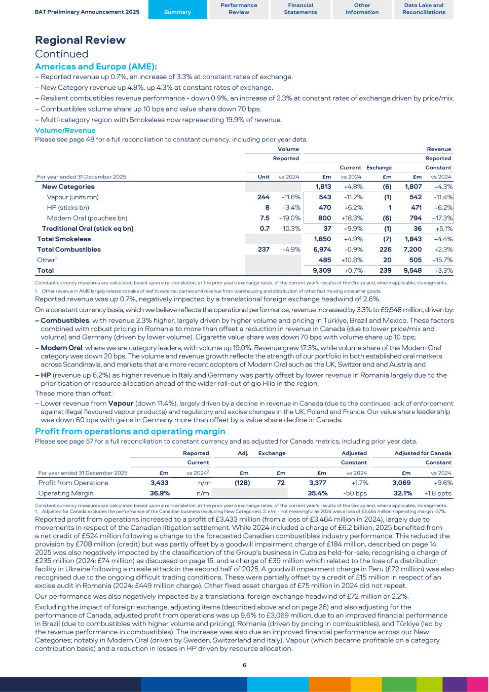 Regional Review Continued Americas and Europe (AME): – Reported revenue up 0.7%, an increase of 3.3% at constant rates of exchange. – New Category revenue up 4.8%, up 4.3% at constant rates of exchange. – Resilient combustibles revenue performance - down 0.9%, an increase of 2.3% at constant rates of exchange driven by price/mix. – Combustibles volume share up 10 bps and value share down 70 bps. – Multi-category region with Smokeless now representing 19.9% of revenue. Volume/Revenue Please see page 48 for a full reconciliation to constant currency, including prior year data. For year ended 31 December 2025 Volume Revenue Reported Reported Current Exchange Constant Unit vs 2024 £m vs 2024 £m £m vs 2024 New Categories 1,813 +4.8 % (6) 1,807 +4.3 % Vapour (units mn) 244 -11.6 % 543 -11.2 % (1) 542 -11.4 % HP (sticks bn) 8 -3.4 % 470 +6.2 % 1 471 +6.2 % Modern Oral (pouches bn) 7.5 +19.0 % 800 +18.3 % (6) 794 +17.3 % Traditional Oral (stick eq bn) 0.7 -10.3 % 37 +9.9 % (1) 36 +5.1 % Total Smokeless 1,850 +4.9 % (7) 1,843 +4.4 % Total Combustibles 237 -4.9 % 6,974 -0.9 % 226 7,200 +2.3 % Other1 485 +10.8 % 20 505 +15.7 % Total 9,309 +0.7 % 239 9,548 +3.3 % Constant currency measures are calculated based upon a re-translation, at the prior year's exchange rates, of the current year's results of the Group and, where applicable, its segments. 1. Other revenue in AME largely relates to sales of leaf to external parties and revenue from warehousing and distribution of other fast moving consumer goods. Reported revenue was up 0.7%, negatively impacted by a translational foreign exchange headwind of 2.6%. On a constant currency basis, which we believe reflects the operational performance, revenue increased by 3.3% to £9,548 million, driven by: – Combustibles, with revenue 2.3% higher, largely driven by higher volume and pricing in Türkiye, Brazil and Mexico. These factors combined with robust pricing in Romania to more than offset a reduction in revenue in Canada (due to lower price/mix and volume) and Germany (driven by lower volume). Cigarette value share was down 70 bps with volume share up 10 bps; – Modern Oral, where we are category leaders, with volume up 19.0%. Revenue grew 17.3%, while volume share of the Modern Oral category was down 20 bps. The volume and revenue growth reflects the strength of our portfolio in both established oral markets across Scandinavia, and markets that are more recent adopters of Modern Oral such as the UK, Switzerland and Austria; and – HP (revenue up 6.2%) as higher revenue in Italy and Germany was partly offset by lower revenue in Romania largely due to the prioritisation of resource allocation ahead of the wider roll-out of glo Hilo in the region. These more than offset: – Lower revenue from Vapour (down 11.4%), largely driven by a decline in revenue in Canada (due to the continued lack of enforcement against illegal flavoured vapour products) and regulatory and excise changes in the UK, Poland and France. Our value share leadership was down 60 bps with gains in Germany more than offset by a value share decline in Canada. Profit from operations and operating margin Please see page 57 for a full reconciliation to constant currency and as adjusted for Canada metrics, including prior year data. For year ended 31 December 2025 Reported Adj. Exchange Adjusted Adjusted for Canada Current Constant Constant £m vs 20242 £m £m £m vs 2024 £m vs 2024 Profit from Operations 3,433 n/m (128) 72 3,377 +1.7 % 3,069 +9.6 % Operating Margin 36.9 % n/m 35.4 % -50 bps 32.1 % +1.8 ppts Constant currency measures are calculated based upon a re-translation, at the prior year's exchange rates, of the current year's results of the Group and, where applicable, its segments. 1. Adjusted for Canada excludes the performance of the Canadian business (excluding New Categories). 2. n/m - not meaningful as 2024 was a loss of £3,464 million / operating margin -37%. Reported profit from operations increased to a profit of £3,433 million (from a loss of £3,464 million in 2024), largely due to movements in respect of the Canadian litigation settlement. While 2024 included a charge of £6.2 billion, 2025 benefited from a net credit of £524 million following a change to the forecasted Canadian combustibles industry performance. This reduced the provision by £708 million (credit) but was partly offset by a goodwill impairment charge of £184 million, described on page 14. 2025 was also negatively impacted by the classification of the Group's business in Cuba as held-for-sale, recognising a charge of £235 million (2024: £74 million) as discussed on page 15, and a charge of £39 million which related to the loss of a distribution facility in Ukraine following a missile attack in the second half of 2025. A goodwill impairment charge in Peru (£72 million) was also recognised due to the ongoing difficult trading conditions. These were partially offset by a credit of £15 million in respect of an excise audit in Romania (2024: £449 million charge). Other fixed asset charges of £75 million in 2024 did not repeat. Our performance was also negatively impacted by a translational foreign exchange headwind of £72 million or 2.2%. Excluding the impact of foreign exchange, adjusting items (described above and on page 26) and also adjusting for the performance of Canada, adjusted profit from operations was up 9.6% to £3,069 million, due to an improved financial performance in Brazil (due to combustibles with higher volume and pricing), Romania (driven by pricing in combustibles), and Türkiye (led by the revenue performance in combustibles). The increase was also due an improved financial performance across our New Categories; notably in Modern Oral (driven by Sweden, Switzerland and Italy), Vapour (which became profitable on a category contribution basis) and a reduction in losses in HP driven by resource allocation. BAT Preliminary Announcement 2025 Summary Performance Revie