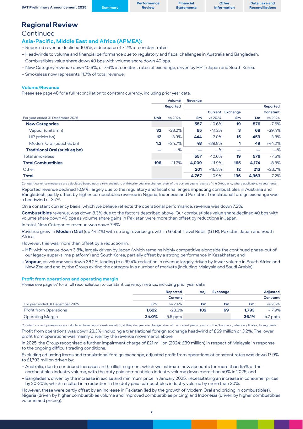 Regional Review Continued Asia-Pacific, Middle East and Africa (APMEA): – Reported revenue declined 10.9%, a decrease of 7.2% at constant rates. – Headwinds to volume and financial performance due to regulatory and fiscal challenges in Australia and Bangladesh. – Combustibles value share down 40 bps with volume share down 40 bps. – New Category revenue down 10.6%, or 7.6% at constant rates of exchange, driven by HP in Japan and South Korea. – Smokeless now represents 11.7% of total revenue. Volume/Revenue Please see page 48 for a full reconciliation to constant currency, including prior year data. For year ended 31 December 2025 Volume Revenue Reported Reported Current Exchange Constant Unit vs 2024 £m vs 2024 £m £m vs 2024 New Categories 557 -10.6 % 19 576 -7.6 % Vapour (units mn) 32 -38.2 % 65 -41.2 % 3 68 -39.4 % HP (sticks bn) 12 -3.9 % 444 -7.0 % 15 459 -3.8 % Modern Oral (pouches bn) 1.2 +24.7 % 48 +39.8 % 1 49 +44.2 % Traditional Oral (stick eq bn) — — % — — % — — — % Total Smokeless 557 -10.6 % 19 576 -7.6 % Total Combustibles 196 -11.7 % 4,009 -11.9 % 165 4,174 -8.3 % Other 201 +16.3 % 12 213 +23.7 % Total 4,767 -10.9 % 196 4,963 -7.2 % Constant currency measures are calculated based upon a re-translation, at the prior year's exchange rates, of the current year's results of the Group and, where applicable, its segments. Reported revenue declined 10.9%, largely due to the regulatory and fiscal challenges impacting combustibles in Australia and Bangladesh, partly offset by higher combustibles revenue in Nigeria, Indonesia and Pakistan. Translational foreign exchange was a headwind of 3.7%. On a constant currency basis, which we believe reflects the operational performance, revenue was down 7.2%. Combustibles revenue, was down 8.3% due to the factors described above. Our combustibles value share declined 40 bps with volume share down 40 bps as volume share gains in Pakistan were more than offset by reductions in Japan. In total, New Categories revenue was down 7.6%. Revenue grew in Modern Oral (up 44.2%) with strong revenue growth in Global Travel Retail (GTR), Pakistan, Japan and South Africa. However, this was more than offset by a reduction in: – HP, with revenue down 3.8%, largely driven by Japan (which remains highly competitive alongside the continued phase-out of our legacy super-slims platform) and South Korea, partially offset by a strong performance in Kazakhstan; and – Vapour, as volume was down 38.2%, leading to a 39.4% reduction in revenue largely driven by lower volume in South Africa and New Zealand and by the Group exiting the category in a number of markets (including Malaysia and Saudi Arabia). Profit from operations and operating margin Please see page 57 for a full reconciliation to constant currency metrics, including prior year data For year ended 31 December 2025 Reported Adj. Exchange Adjusted Current Constant £m vs 2024 £m £m £m vs 2024 Profit from Operations 1,622 -23.3 % 102 69 1,793 -17.9 % Operating Margin 34.0 % -5.5 ppts 36.1 % -4.7 ppts Constant currency measures are calculated based upon a re-translation, at the prior year's exchange rates, of the current year's results of the Group and, where applicable, its segments. Profit from operations was down 23.3%, including a translational foreign exchange headwind of £69 million or 3.2%. The lower profit from operations was mainly driven by the revenue movements above. In 2025, the Group recognised a further impairment charge of £21 million (2024: £39 million) in respect of Malaysia in response to the ongoing difficult trading conditions. Excluding adjusting items and translational foreign exchange, adjusted profit from operations at constant rates was down 17.9% to £1,793 million driven by: – Australia, due to continued increases in the illicit segment which we estimate now accounts for more than 65% of the combustibles industry volume, with the duty paid combustibles industry volume down more than 40% in 2025; and – Bangladesh, driven by the increase in excise and minimum price in January 2025, necessitating an increase in consumer prices by 20-30%, which resulted in a reduction in the duty paid combustibles industry volume by more than 20%. However, these were partly offset by an increase in Pakistan (led by the growth of Modern Oral and pricing in combustibles), Nigeria (driven by higher combustibles volume and improved combustibles pricing) and Indonesia (driven by higher combustibles volume and pricing). BAT Preliminary Announcement 2025 Summary Performance Review Financial Statements Other Information Data Lake and Reconciliations 7