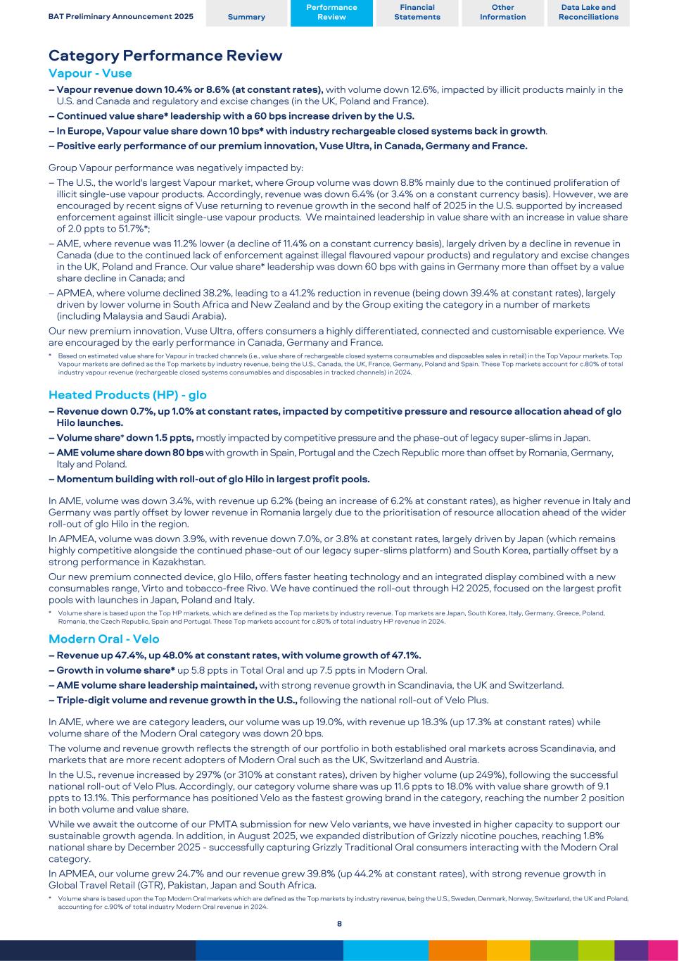 Category Performance Review Vapour - Vuse – Vapour revenue down 10.4% or 8.6% (at constant rates), with volume down 12.6%, impacted by illicit products mainly in the U.S. and Canada and regulatory and excise changes (in the UK, Poland and France). – Continued value share* leadership with a 60 bps increase driven by the U.S. – In Europe, Vapour value share down 10 bps* with industry rechargeable closed systems back in growth. – Positive early performance of our premium innovation, Vuse Ultra, in Canada, Germany and France. Group Vapour performance was negatively impacted by: – The U.S., the world's largest Vapour market, where Group volume was down 8.8% mainly due to the continued proliferation of illicit single-use vapour products. Accordingly, revenue was down 6.4% (or 3.4% on a constant currency basis). However, we are encouraged by recent signs of Vuse returning to revenue growth in the second half of 2025 in the U.S. supported by increased enforcement against illicit single-use vapour products. We maintained leadership in value share with an increase in value share of 2.0 ppts to 51.7%*; – AME, where revenue was 11.2% lower (a decline of 11.4% on a constant currency basis), largely driven by a decline in revenue in Canada (due to the continued lack of enforcement against illegal flavoured vapour products) and regulatory and excise changes in the UK, Poland and France. Our value share* leadership was down 60 bps with gains in Germany more than offset by a value share decline in Canada; and – APMEA, where volume declined 38.2%, leading to a 41.2% reduction in revenue (being down 39.4% at constant rates), largely driven by lower volume in South Africa and New Zealand and by the Group exiting the category in a number of markets (including Malaysia and Saudi Arabia). Our new premium innovation, Vuse Ultra, offers consumers a highly differentiated, connected and customisable experience. We are encouraged by the early performance in Canada, Germany and France. * Based on estimated value share for Vapour in tracked channels (i.e., value share of rechargeable closed systems consumables and disposables sales in retail) in the Top Vapour markets. Top Vapour markets are defined as the Top markets by industry revenue, being the U.S., Canada, the UK, France, Germany, Poland and Spain. These Top markets account for c.80% of total industry vapour revenue (rechargeable closed systems consumables and disposables in tracked channels) in 2024. Heated Products (HP) - glo – Revenue down 0.7%, up 1.0% at constant rates, impacted by competitive pressure and resource allocation ahead of glo Hilo launches. – Volume share* down 1.5 ppts, mostly impacted by competitive pressure and the phase-out of legacy super-slims in Japan. – AME volume share down 80 bps with growth in Spain, Portugal and the Czech Republic more than offset by Romania, Germany, Italy and Poland. – Momentum building with roll-out of glo Hilo in largest profit pools. In AME, volume was down 3.4%, with revenue up 6.2% (being an increase of 6.2% at constant rates), as higher revenue in Italy and Germany was partly offset by lower revenue in Romania largely due to the prioritisation of resource allocation ahead of the wider roll-out of glo Hilo in the region. In APMEA, volume was down 3.9%, with revenue down 7.0%, or 3.8% at constant rates, largely driven by Japan (which remains highly competitive alongside the continued phase-out of our legacy super-slims platform) and South Korea, partially offset by a strong performance in Kazakhstan. Our new premium connected device, glo Hilo, offers faster heating technology and an integrated display combined with a new consumables range, Virto and tobacco-free Rivo. We have continued the roll-out through H2 2025, focused on the largest profit pools with launches in Japan, Poland and Italy. * Volume share is based upon the Top HP markets, which are defined as the Top markets by industry revenue. Top markets are Japan, South Korea, Italy, Germany, Greece, Poland, Romania, the Czech Republic, Spain and Portugal. These Top markets account for c.80% of total industry HP revenue in 2024. Modern Oral - Velo – Revenue up 47.4%, up 48.0% at constant rates, with volume growth of 47.1%. – Growth in volume share* up 5.8 ppts in Total Oral and up 7.5 ppts in Modern Oral. – AME volume share leadership maintained, with strong revenue growth in Scandinavia, the UK and Switzerland. – Triple-digit volume and revenue growth in the U.S., following the national roll-out of Velo Plus. In AME, where we are category leaders, our volume was up 19.0%, with revenue up 18.3% (up 17.3% at constant rates) while volume share of the Modern Oral category was down 20 bps. The volume and revenue growth reflects the strength of our portfolio in both established oral markets across Scandinavia, and markets that are more recent adopters of Modern Oral such as the UK, Switzerland and Austria. In the U.S., revenue increased by 297% (or 310% at constant rates), driven by higher volume (up 249%), following the successful national roll-out of Velo Plus. Accordingly, our category volume share was up 11.6 ppts to 18.0% with value share growth of 9.1 ppts to 13.1%. This performance has positioned Velo as the fastest growing brand in the category, reaching the number 2 position in both volume and value share. While we await the outcome of our PMTA submission for new Velo variants, we have invested in higher capacity to support our sustainable growth agenda. In addition, in August 2025, we expanded distribution of Grizzly nicotine pouches, reaching 1.8% national share by December 2025 - successfully capturing Grizzly Traditional Oral consumers interacting with the Modern Oral category. In APMEA, our volume grew 24.7% and our revenue grew 39.8% (up 44.2% at constant rates), with strong revenue growth in Global Travel Retail (GTR), Pakistan, Japan and South Africa. * Volume share is based upon the Top Modern Oral markets which