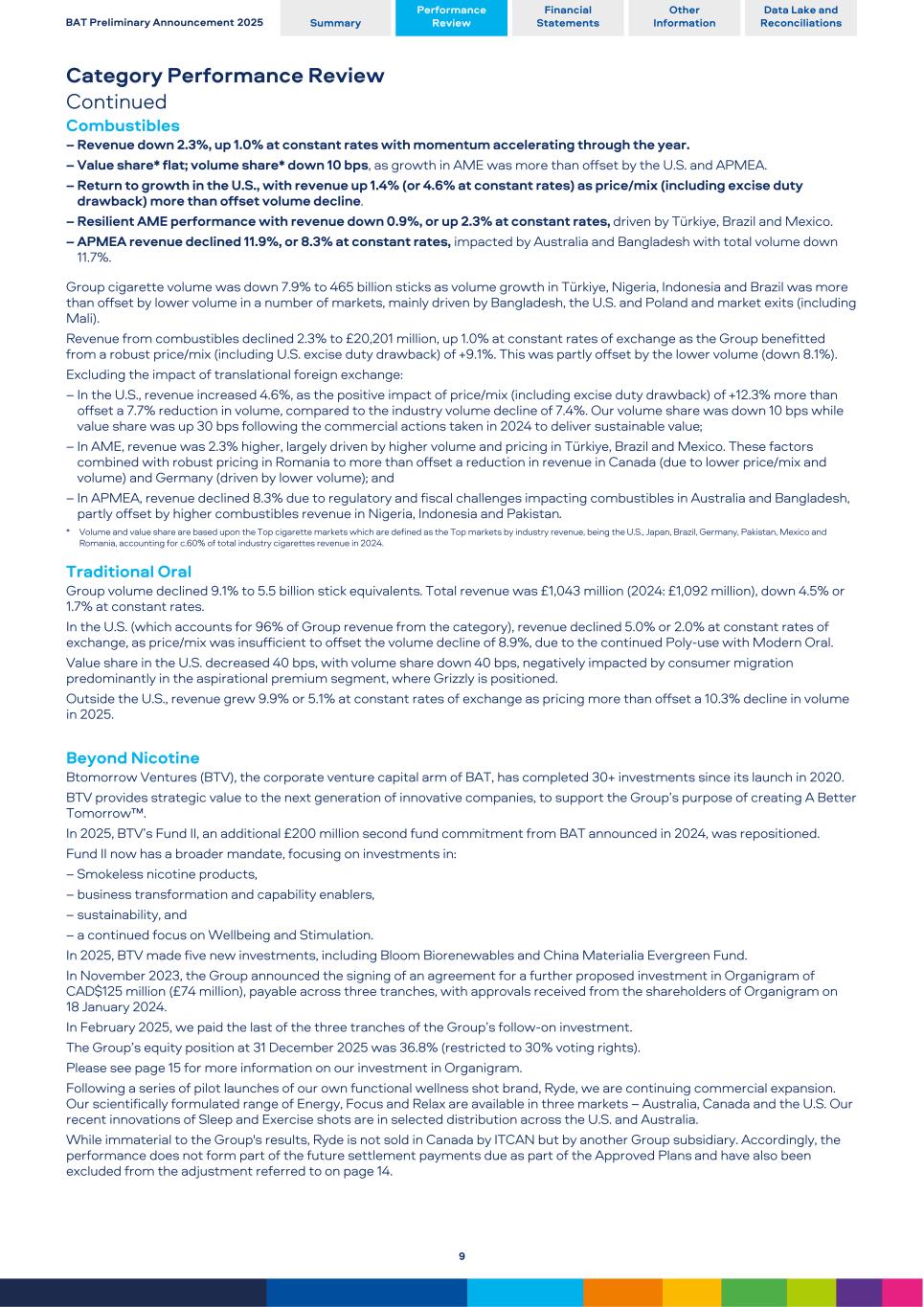 Category Performance Review Continued Combustibles – Revenue down 2.3%, up 1.0% at constant rates with momentum accelerating through the year. – Value share* flat; volume share* down 10 bps, as growth in AME was more than offset by the U.S. and APMEA. – Return to growth in the U.S., with revenue up 1.4% (or 4.6% at constant rates) as price/mix (including excise duty drawback) more than offset volume decline. – Resilient AME performance with revenue down 0.9%, or up 2.3% at constant rates, driven by Türkiye, Brazil and Mexico. – APMEA revenue declined 11.9%, or 8.3% at constant rates, impacted by Australia and Bangladesh with total volume down 11.7%. Group cigarette volume was down 7.9% to 465 billion sticks as volume growth in Türkiye, Nigeria, Indonesia and Brazil was more than offset by lower volume in a number of markets, mainly driven by Bangladesh, the U.S. and Poland and market exits (including Mali). Revenue from combustibles declined 2.3% to £20,201 million, up 1.0% at constant rates of exchange as the Group benefitted from a robust price/mix (including U.S. excise duty drawback) of +9.1%. This was partly offset by the lower volume (down 8.1%). Excluding the impact of translational foreign exchange: – In the U.S., revenue increased 4.6%, as the positive impact of price/mix (including excise duty drawback) of +12.3% more than offset a 7.7% reduction in volume, compared to the industry volume decline of 7.4%. Our volume share was down 10 bps while value share was up 30 bps following the commercial actions taken in 2024 to deliver sustainable value; – In AME, revenue was 2.3% higher, largely driven by higher volume and pricing in Türkiye, Brazil and Mexico. These factors combined with robust pricing in Romania to more than offset a reduction in revenue in Canada (due to lower price/mix and volume) and Germany (driven by lower volume); and – In APMEA, revenue declined 8.3% due to regulatory and fiscal challenges impacting combustibles in Australia and Bangladesh, partly offset by higher combustibles revenue in Nigeria, Indonesia and Pakistan. * Volume and value share are based upon the Top cigarette markets which are defined as the Top markets by industry revenue, being the U.S., Japan, Brazil, Germany, Pakistan, Mexico and Romania, accounting for c.60% of total industry cigarettes revenue in 2024. Traditional Oral Group volume declined 9.1% to 5.5 billion stick equivalents. Total revenue was £1,043 million (2024: £1,092 million), down 4.5% or 1.7% at constant rates. In the U.S. (which accounts for 96% of Group revenue from the category), revenue declined 5.0% or 2.0% at constant rates of exchange, as price/mix was insufficient to offset the volume decline of 8.9%, due to the continued Poly-use with Modern Oral. Value share in the U.S. decreased 40 bps, with volume share down 40 bps, negatively impacted by consumer migration predominantly in the aspirational premium segment, where Grizzly is positioned. Outside the U.S., revenue grew 9.9% or 5.1% at constant rates of exchange as pricing more than offset a 10.3% decline in volume in 2025. Beyond Nicotine Btomorrow Ventures (BTV), the corporate venture capital arm of BAT, has completed 30+ investments since its launch in 2020. BTV provides strategic value to the next generation of innovative companies, to support the Group’s purpose of creating A Better Tomorrow™. In 2025, BTV’s Fund II, an additional £200 million second fund commitment from BAT announced in 2024, was repositioned. Fund II now has a broader mandate, focusing on investments in: – Smokeless nicotine products, – business transformation and capability enablers, – sustainability, and – a continued focus on Wellbeing and Stimulation. In 2025, BTV made five new investments, including Bloom Biorenewables and China Materialia Evergreen Fund. In November 2023, the Group announced the signing of an agreement for a further proposed investment in Organigram of CAD$125 million (£74 million), payable across three tranches, with approvals received from the shareholders of Organigram on 18 January 2024. In February 2025, we paid the last of the three tranches of the Group’s follow-on investment. The Group’s equity position at 31 December 2025 was 36.8% (restricted to 30% voting rights). Please see page 15 for more information on our investment in Organigram. Following a series of pilot launches of our own functional wellness shot brand, Ryde, we are continuing commercial expansion. Our scientifically formulated range of Energy, Focus and Relax are available in three markets – Australia, Canada and the U.S. Our recent innovations of Sleep and Exercise shots are in selected distribution across the U.S. and Australia. While immaterial to the Group's results, Ryde is not sold in Canada by ITCAN but by another Group subsidiary. Accordingly, the performance does not form part of the future settlement payments due as part of the Approved Plans and have also been excluded from the adjustment referred to on page 14. BAT Preliminary Announcement 2025 Summary Performance Review Financial Statements Other Information Data Lake and Reconciliations 9