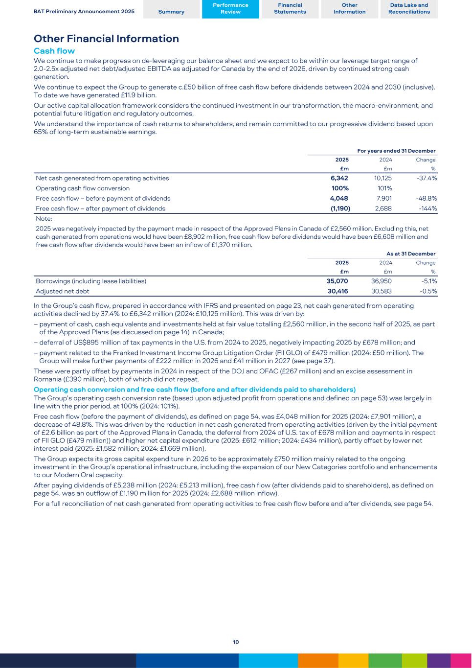 Other Financial Information Cash flow We continue to make progress on de-leveraging our balance sheet and we expect to be within our leverage target range of 2.0-2.5x adjusted net debt/adjusted EBITDA as adjusted for Canada by the end of 2026, driven by continued strong cash generation. We continue to expect the Group to generate c.£50 billion of free cash flow before dividends between 2024 and 2030 (inclusive). To date we have generated £11.9 billion. Our active capital allocation framework considers the continued investment in our transformation, the macro-environment, and potential future litigation and regulatory outcomes. We understand the importance of cash returns to shareholders, and remain committed to our progressive dividend based upon 65% of long-term sustainable earnings. For years ended 31 December 2025 2024 Change £m £m % Net cash generated from operating activities 6,342 10,125 -37.4 % Operating cash flow conversion 100% 101% Free cash flow – before payment of dividends 4,048 7,901 -48.8 % Free cash flow – after payment of dividends (1,190) 2,688 -144 % Note: 2025 was negatively impacted by the payment made in respect of the Approved Plans in Canada of £2,560 million. Excluding this, net cash generated from operations would have been £8,902 million, free cash flow before dividends would have been £6,608 million and free cash flow after dividends would have been an inflow of £1,370 million. As at 31 December 2025 2024 Change £m £m % Borrowings (including lease liabilities) 35,070 36,950 -5.1 % Adjusted net debt 30,416 30,583 -0.5 % In the Group’s cash flow, prepared in accordance with IFRS and presented on page 23, net cash generated from operating activities declined by 37.4% to £6,342 million (2024: £10,125 million). This was driven by: – payment of cash, cash equivalents and investments held at fair value totalling £2,560 million, in the second half of 2025, as part of the Approved Plans (as discussed on page 14) in Canada; – deferral of US$895 million of tax payments in the U.S. from 2024 to 2025, negatively impacting 2025 by £678 million; and – payment related to the Franked Investment Income Group Litigation Order (FII GLO) of £479 million (2024: £50 million). The Group will make further payments of £222 million in 2026 and £41 million in 2027 (see page 37). These were partly offset by payments in 2024 in respect of the DOJ and OFAC (£267 million) and an excise assessment in Romania (£390 million), both of which did not repeat. Operating cash conversion and free cash flow (before and after dividends paid to shareholders) The Group’s operating cash conversion rate (based upon adjusted profit from operations and defined on page 53) was largely in line with the prior period, at 100% (2024: 101%). Free cash flow (before the payment of dividends), as defined on page 54, was £4,048 million for 2025 (2024: £7,901 million), a decrease of 48.8%. This was driven by the reduction in net cash generated from operating activities (driven by the initial payment of £2.6 billion as part of the Approved Plans in Canada, the deferral from 2024 of U.S. tax of £678 million and payments in respect of FII GLO (£479 million)) and higher net capital expenditure (2025: £612 million; 2024: £434 million), partly offset by lower net interest paid (2025: £1,582 million; 2024: £1,669 million). The Group expects its gross capital expenditure in 2026 to be approximately £750 million mainly related to the ongoing investment in the Group’s operational infrastructure, including the expansion of our New Categories portfolio and enhancements to our Modern Oral capacity. After paying dividends of £5,238 million (2024: £5,213 million), free cash flow (after dividends paid to shareholders), as defined on page 54, was an outflow of £1,190 million for 2025 (2024: £2,688 million inflow). For a full reconciliation of net cash generated from operating activities to free cash flow before and after dividends, see page 54. BAT Preliminary Announcement 2025 Summary Performance Review Financial Statements Other Information Data Lake and Reconciliations 10